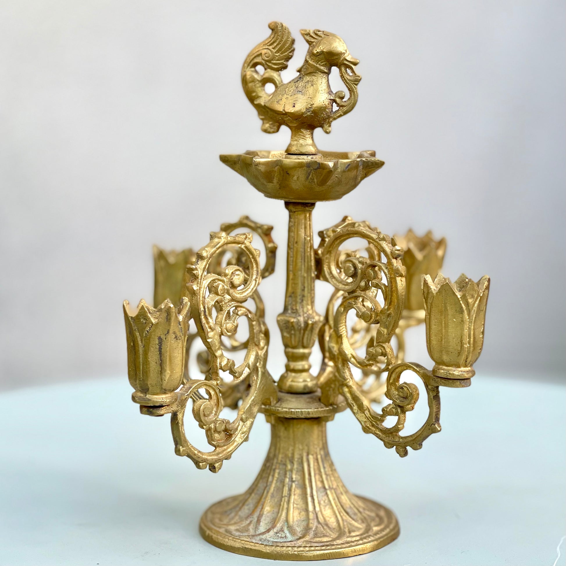 Transform your space with the sophisticated allure of this brass candelabra, a masterful blend of artistry and functionality. At the pinnacle of this exquisite piece, a meticulously detailed Annam-an elegant mythical bird-graces the top, symbolizing grace and nobility. Each of the four candle holders, designed in the shape of delicate flowers, is crafted to enhance the candlelight's soft, flickering glow, creating a mesmerizing play of light and shadow. The candelabra's intricate craftsmanship and timeless design effortlessly infuse any room with both classic charm and a hint of vintage sophistication.