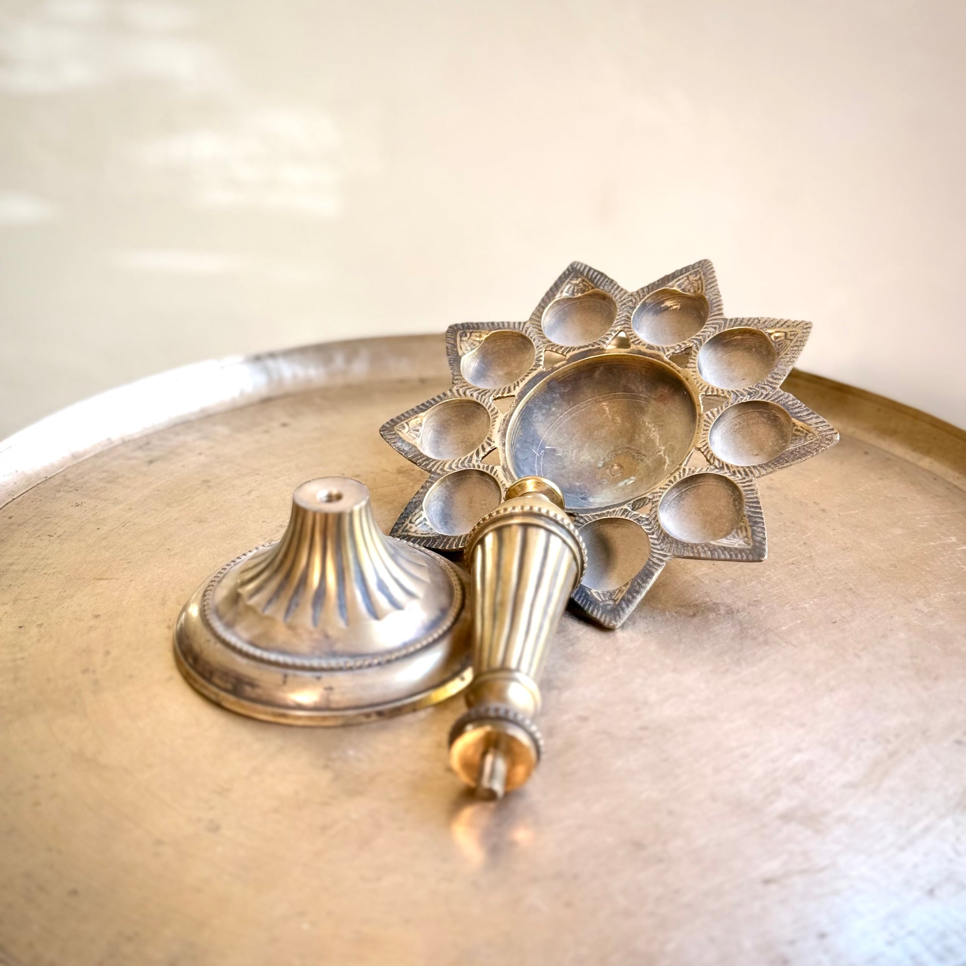 A striking brass standing Diya crafted with a beautiful nine-wick floral shaped top and an elegant tapered pedestal base. The wide flower-inspired plate features eight shallow wick holders arranged around a smooth central bowl, all framed with fine hand-etched detailing.