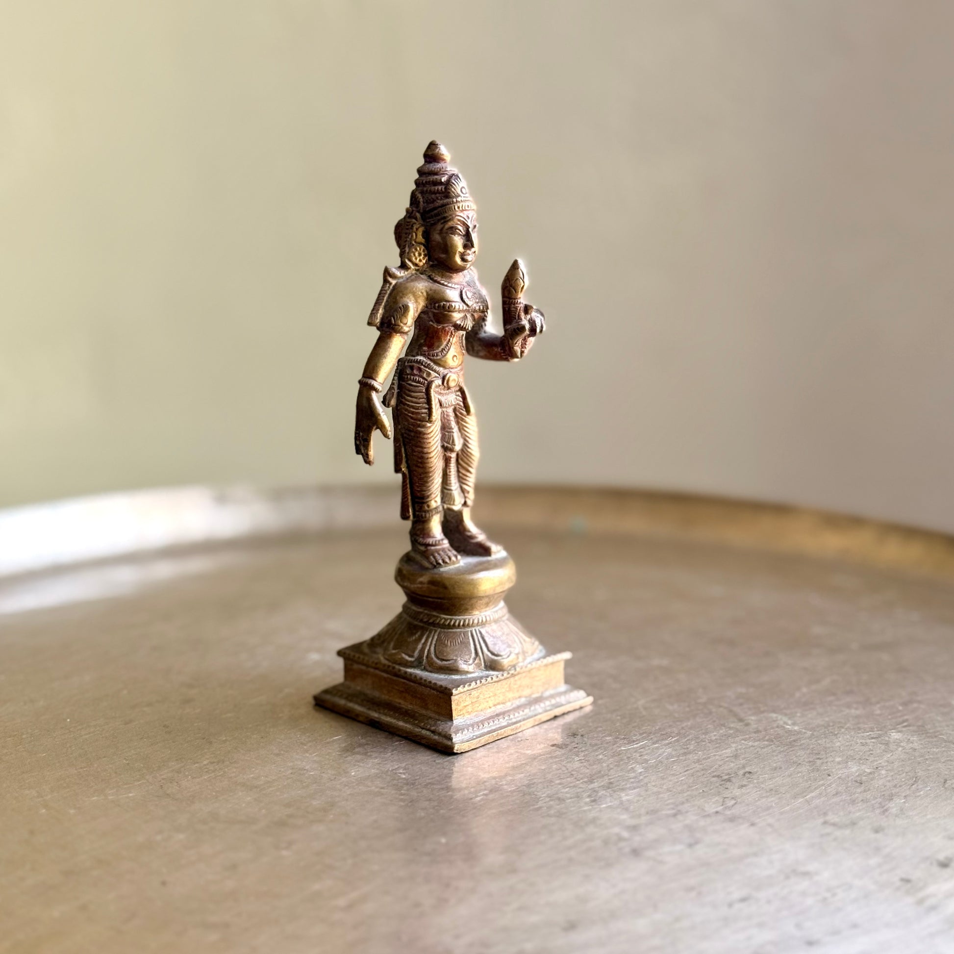 Cast in Panchaloha, the sacred five-metal alloy of gold, silver, copper, iron, and zinc, this idol holds deep spiritual significance and is traditionally revered for its ability to attract positive energy and harmony. The natural aged finish and light signs of wear show its authenticity, making it a true vintage piece that is around 60 years old.