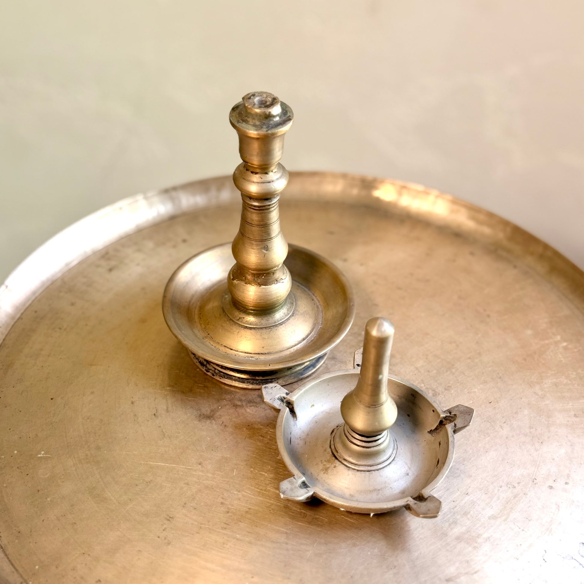 Crafted from brass with intricate detailing, this vintage lamp features a wide base and a tall, elegant stem leading to the bowl where the cotton wick rests. Fueled traditionally by sesame or coconut oil, it emits a warm, steady glow that transforms any space into one of serenity and sanctity. The lamp comes in two separable parts with a distinctive twist-to-lock mechanism, reflecting both functional craftsmanship and timeless design.