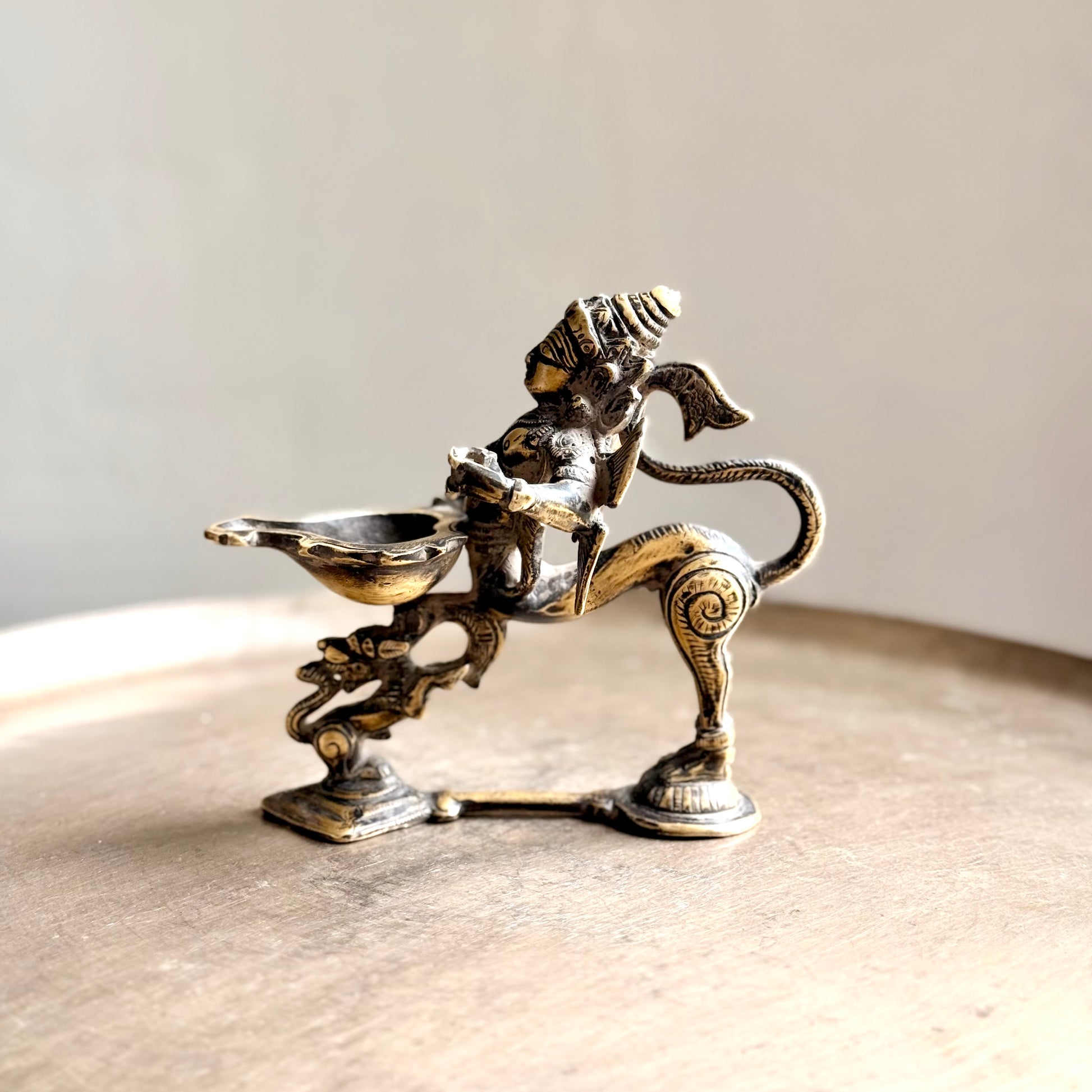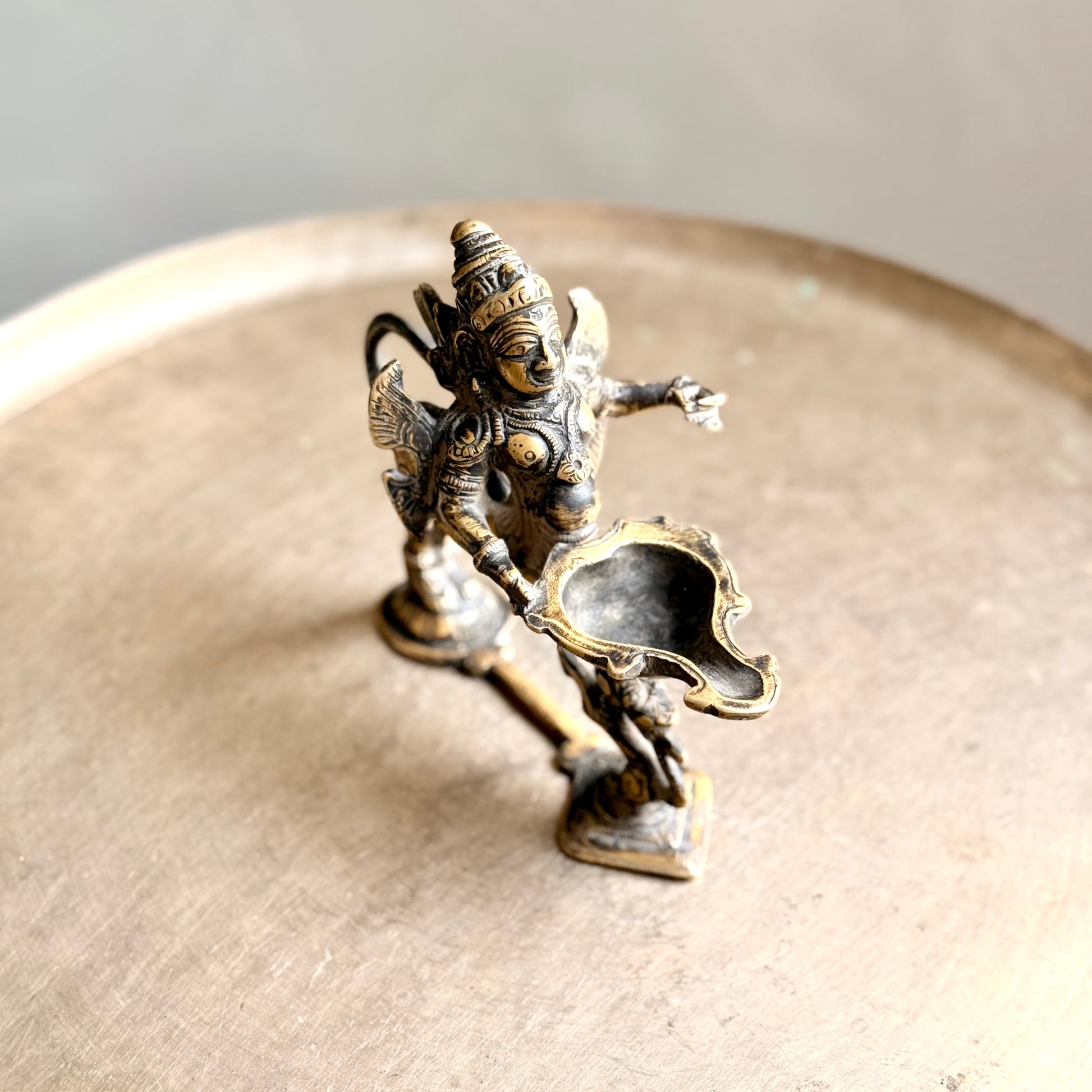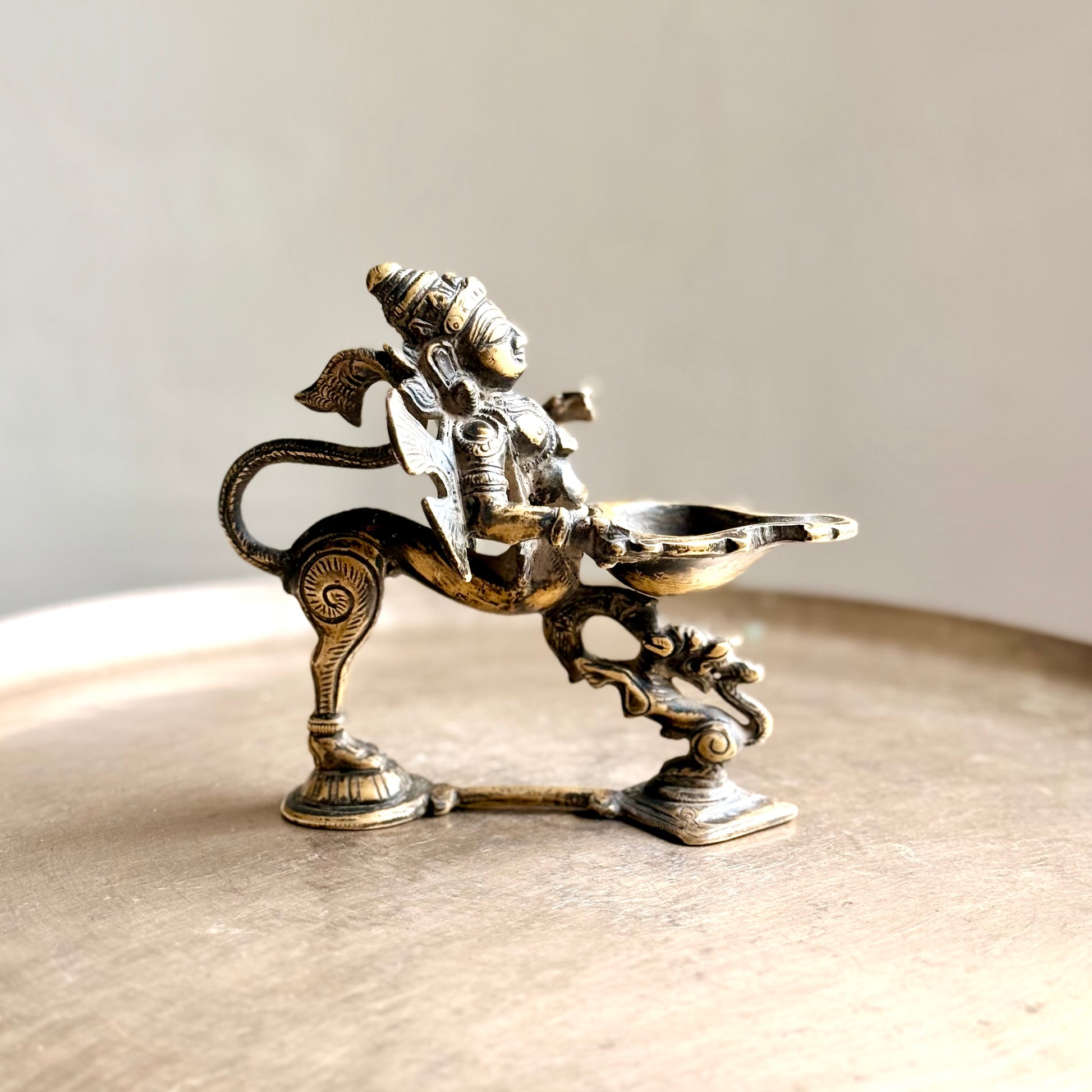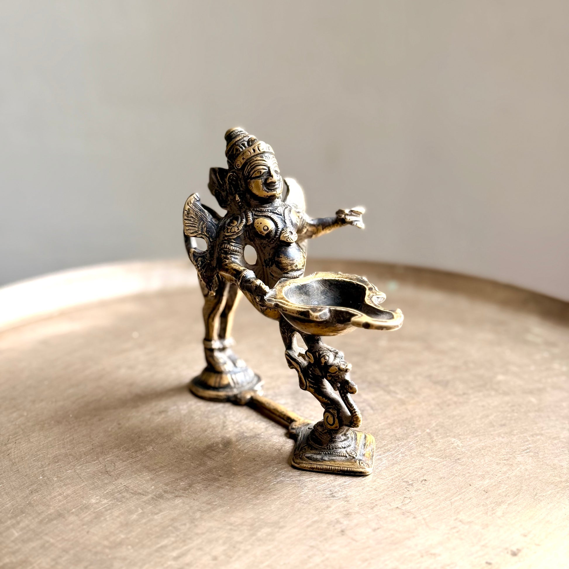Gaze upon its form, and you'll witness the upper part adorned with the divine presence of Lakshmi, complete with majestic wings. In her graceful hands, she cradles a votive lamp reminiscent of Deepalakshmi, radiating light and blessings. Surrounding her are the vigilant miniature Yali protectors, ensuring her safety.