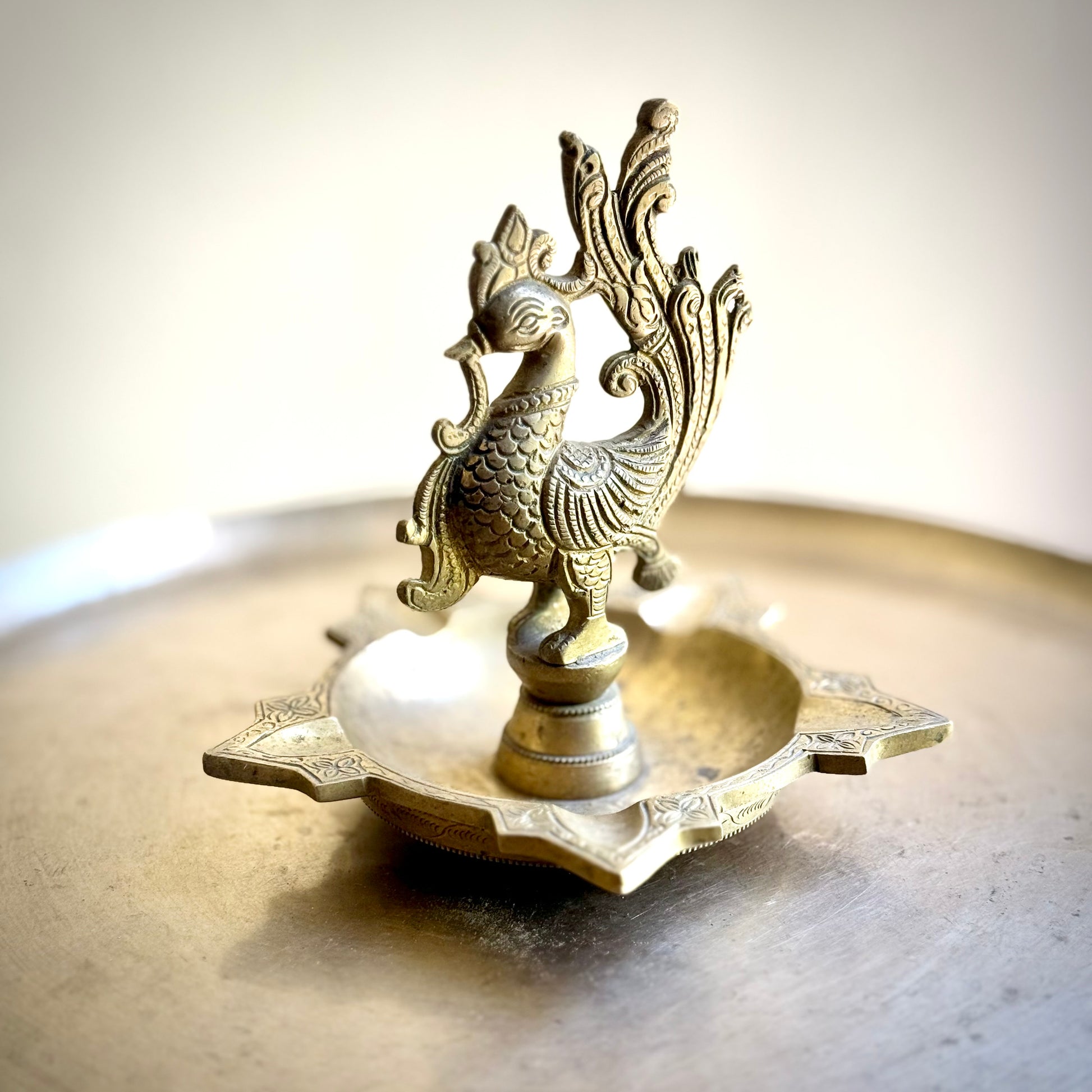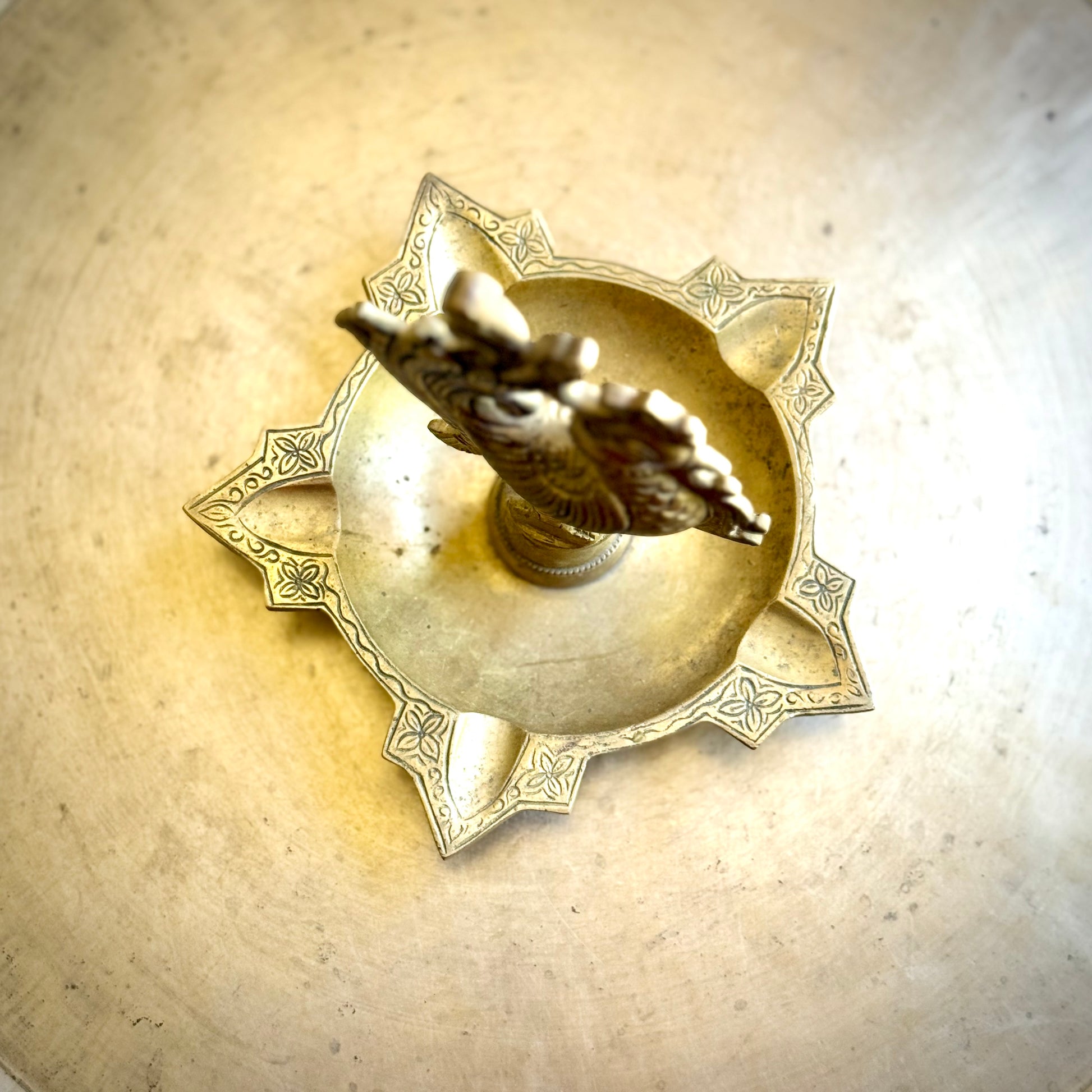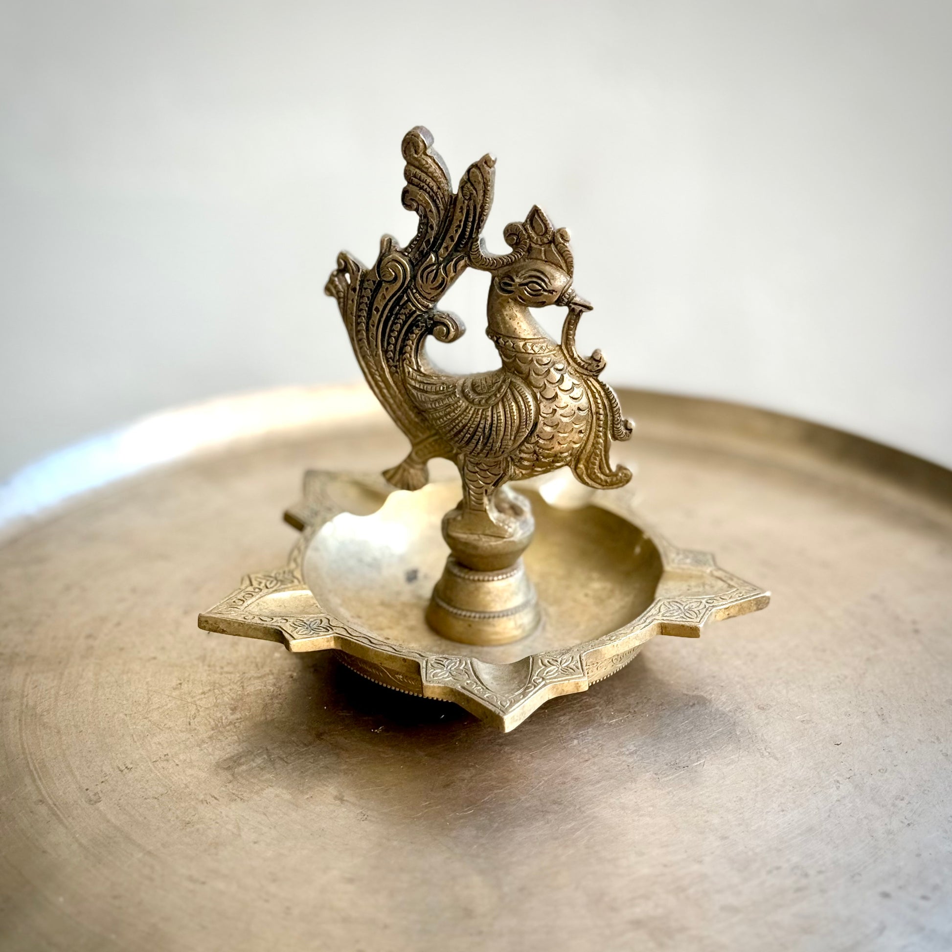 A stunning example of traditional South Indian craftsmanship, this vintage brass diya features an intricately sculpted peacock perched gracefully above a star-shaped base. The detailed feather work and textured body reflect meticulous hand casting, evoking the regal symbolism of the peacock — prosperity, beauty, and divine grace.