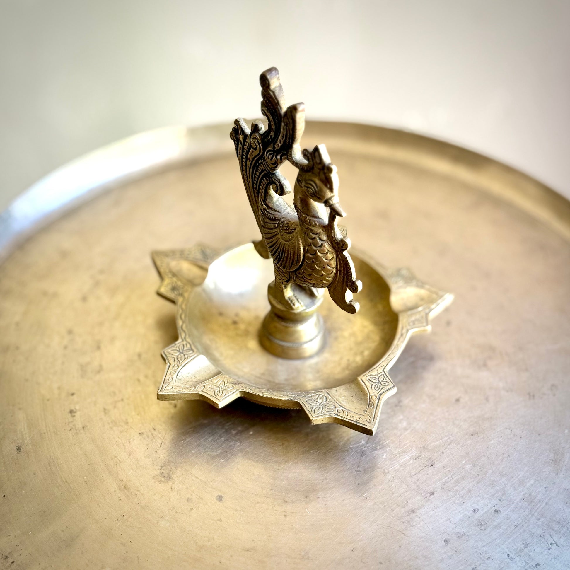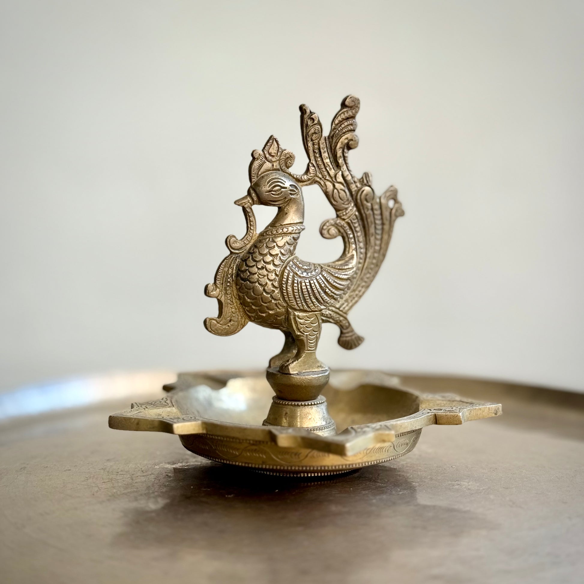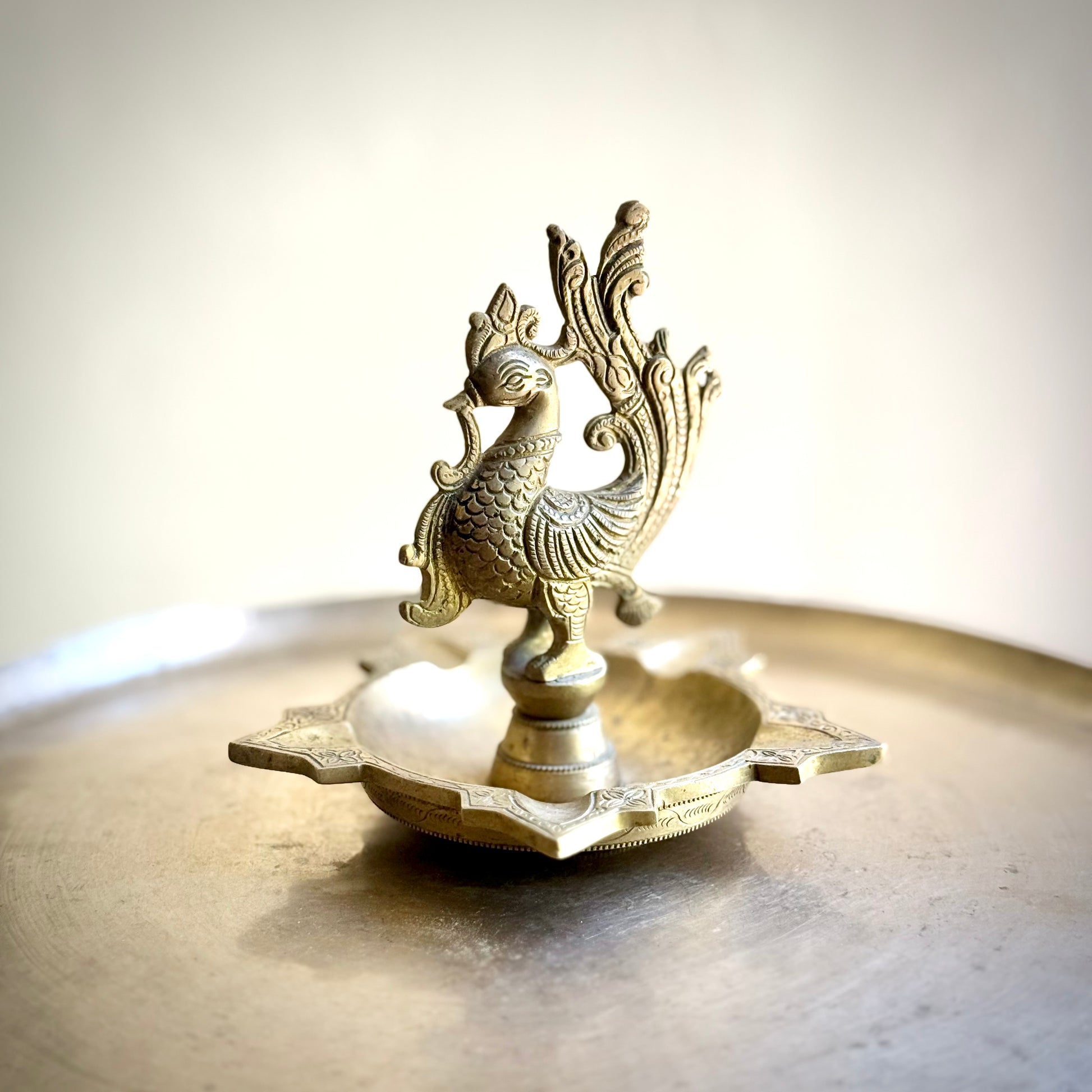 A stunning example of traditional South Indian craftsmanship, this vintage brass diya features an intricately sculpted peacock perched gracefully above a star-shaped base. The detailed feather work and textured body reflect meticulous hand casting, evoking the regal symbolism of the peacock — prosperity, beauty, and divine grace.