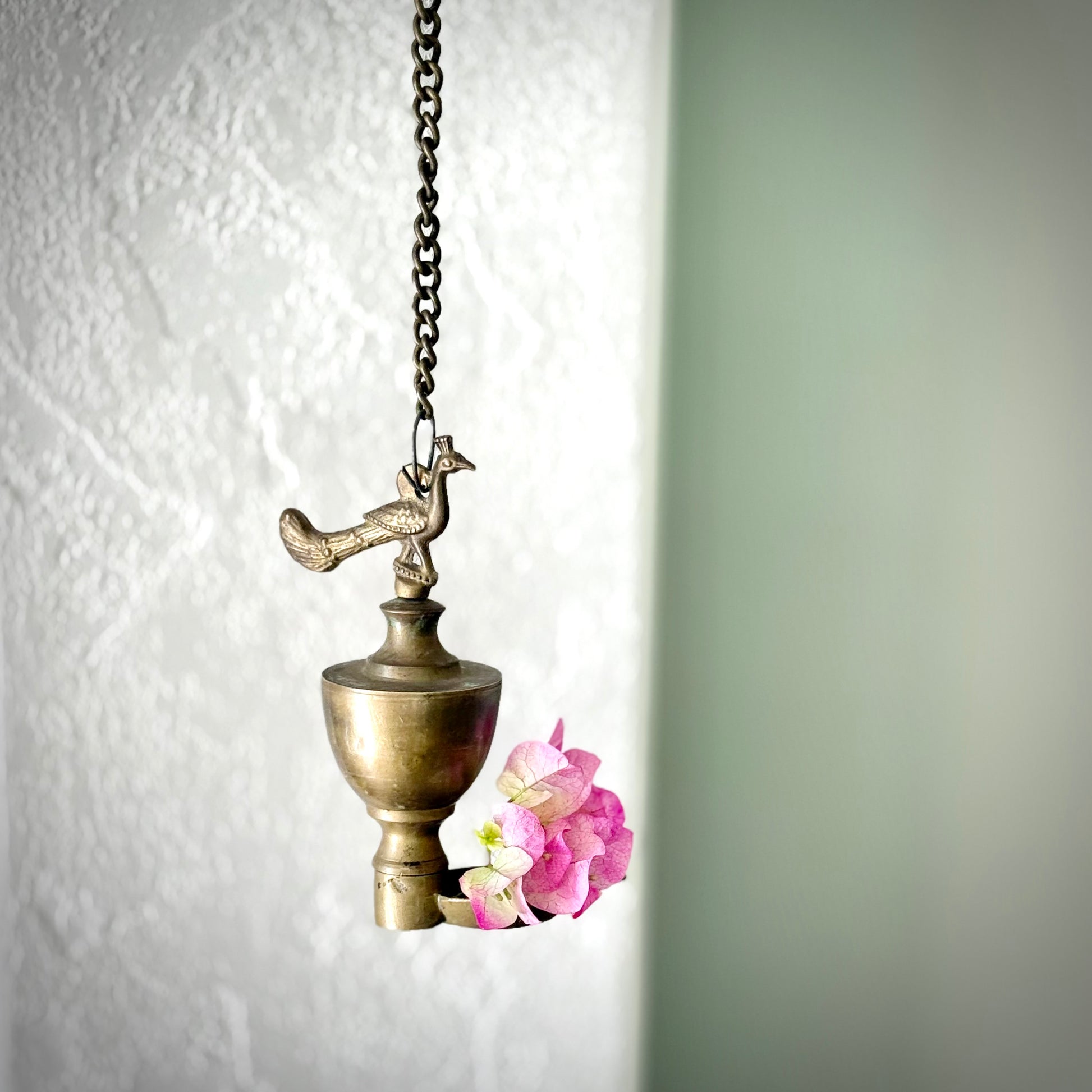 Unveil the enchanting 'Thoondamani Vilakku,' a vintage perpetual lamp originating from Tamil Nadu, South India. Also known as 'Keda Vilakku' in Malayalam, this hanging votive lamp boasts a unique design featuring a peacock at the top, and a grand ball-shaped reservoir originally designed for pouring ghee. This exquisite piece holds profound historical significance, tracing its roots back to the Sangam period in South Indian history.