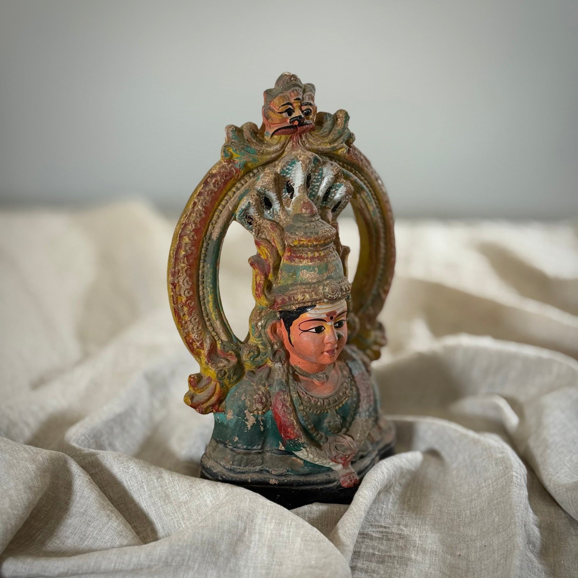Bring home a sacred piece of South Indian heritage with this exquisite, over 95-year-old clay figurine of Goddess Mariamman. Sourced from a Tamil Brahmin home in Madhampatti, Tamil Nadu — a family long associated with temple service — this handcrafted and hand-painted terracotta bust carries generations of faith and devotional energy.