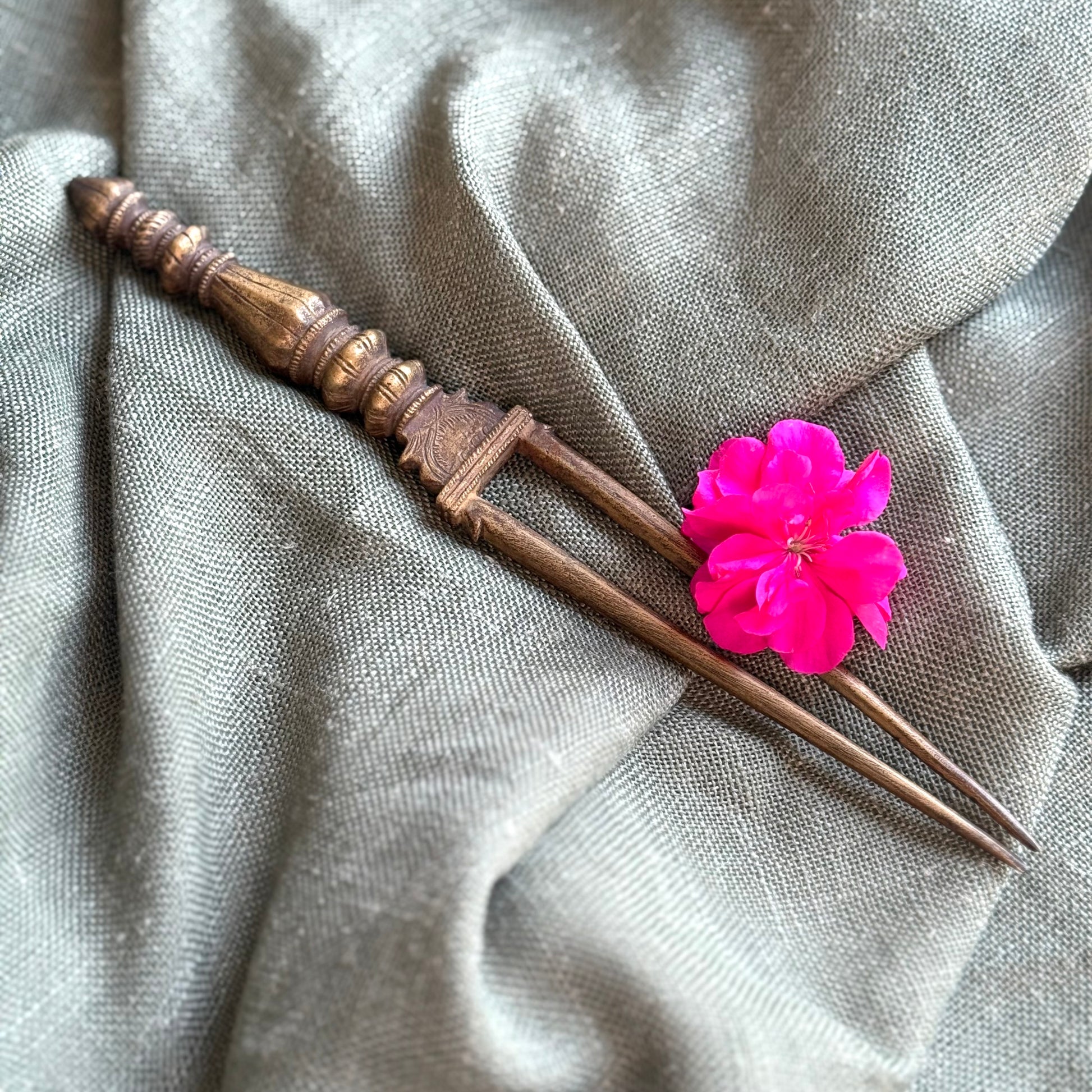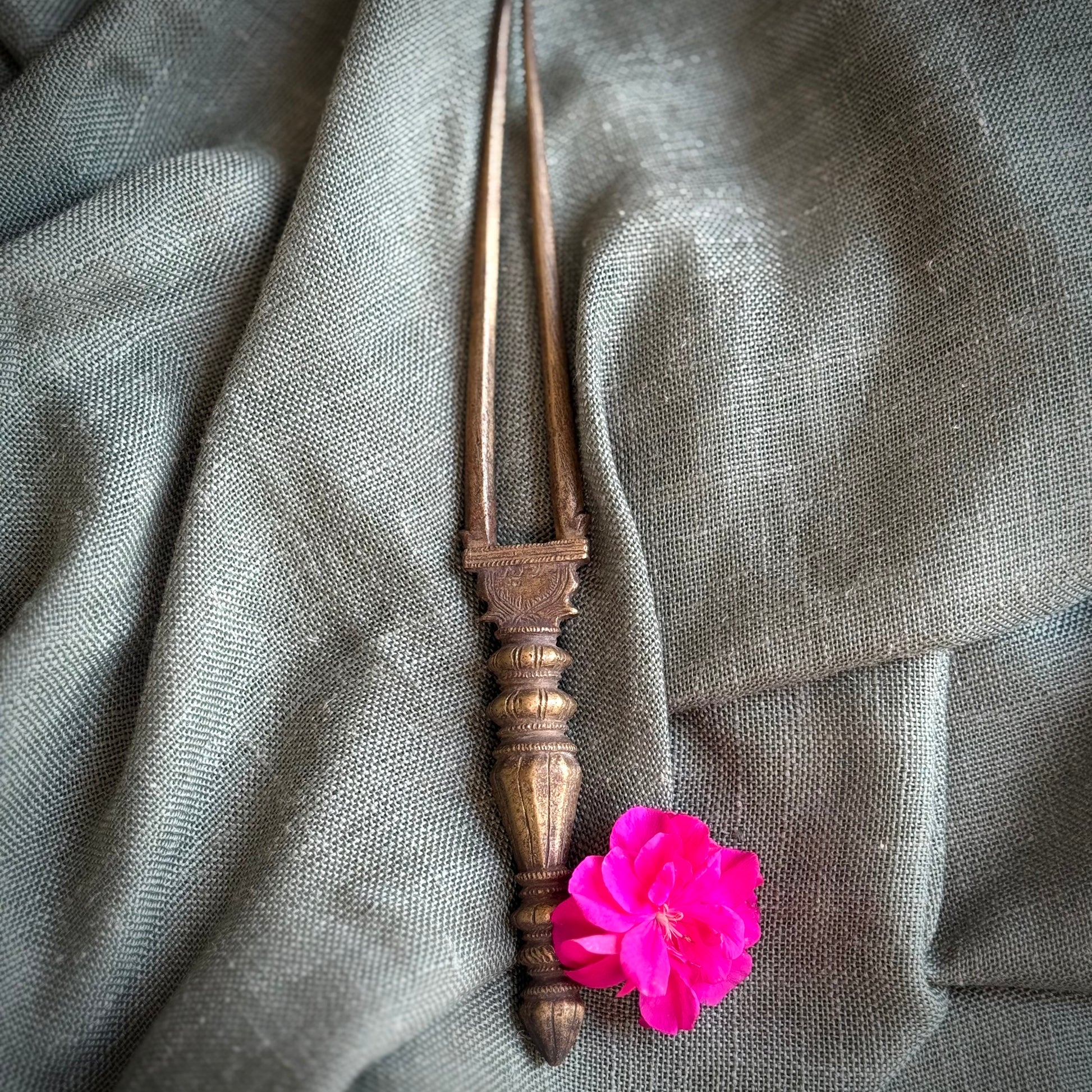 A timeless piece of artistry and function, this vintage brass hair detangler showcases India’s rich tradition of handcrafted metalwork. Designed with dual prongs and an intricately carved handle, it combines beauty with utility, making it as much a collectible as it is a practical grooming tool.