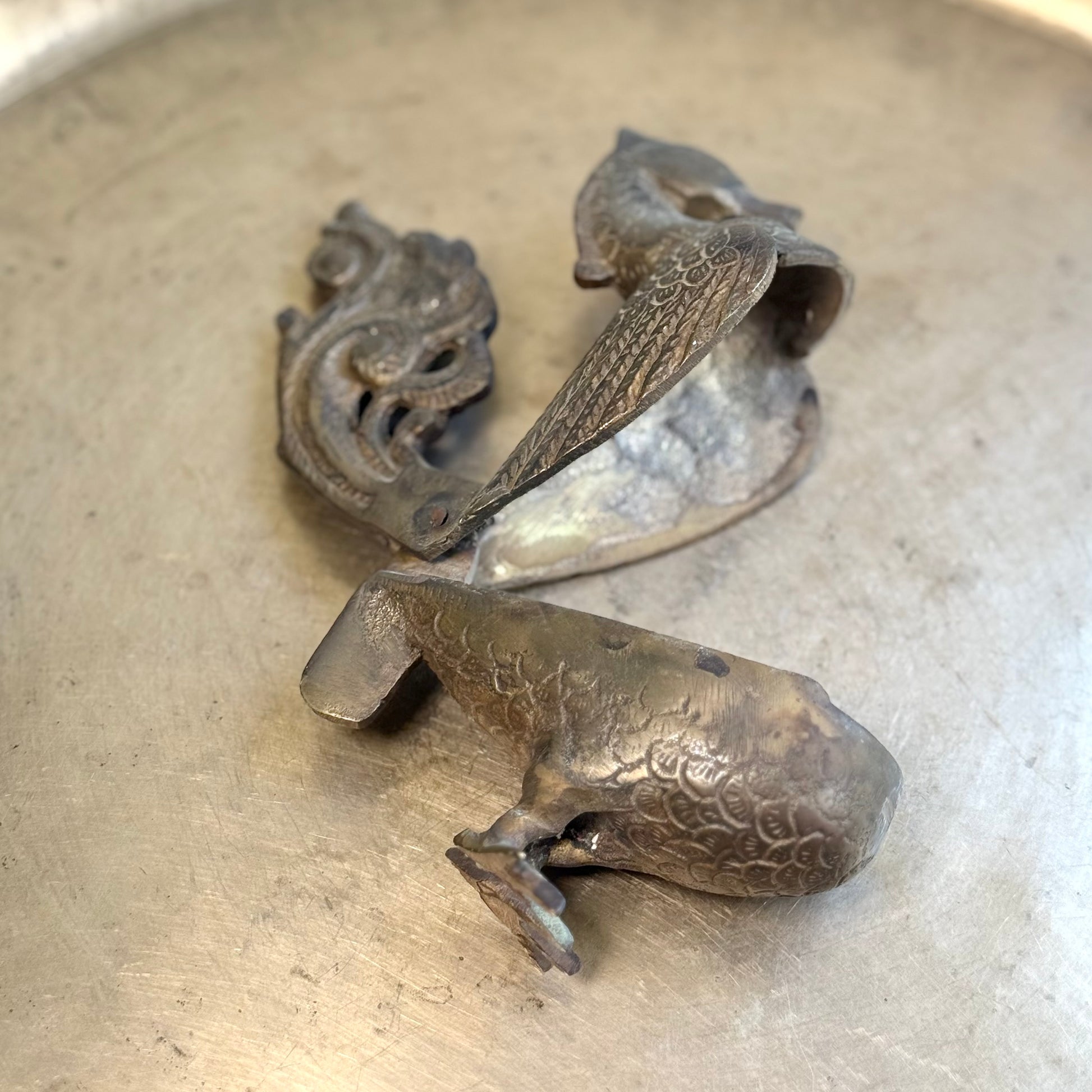 This vintage peacock-shaped brass box is as functional as it is beautiful. Intricately detailed with etched feathers, a graceful neck, and an ornate openwork tail, it captures the elegance of traditional Indian craftsmanship.