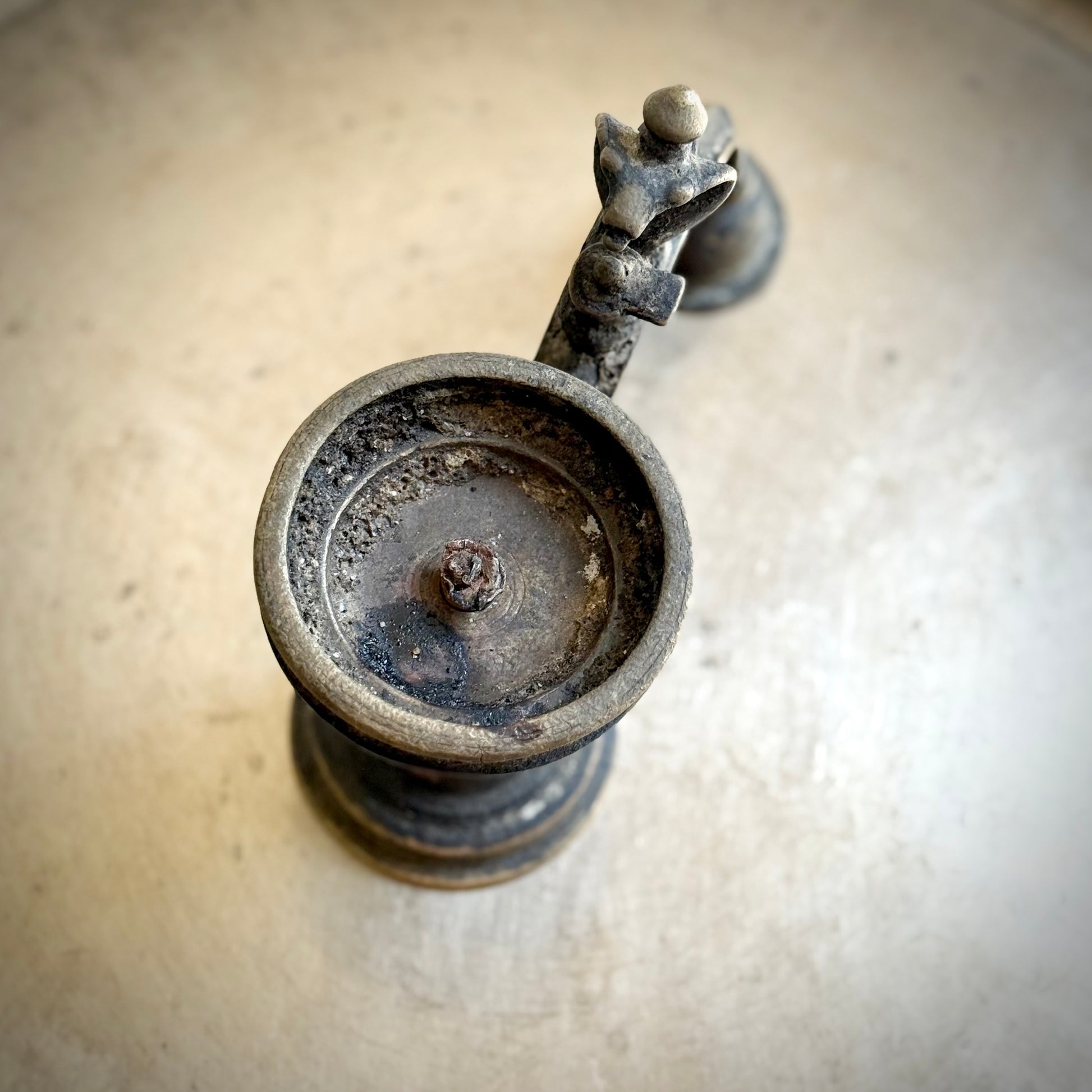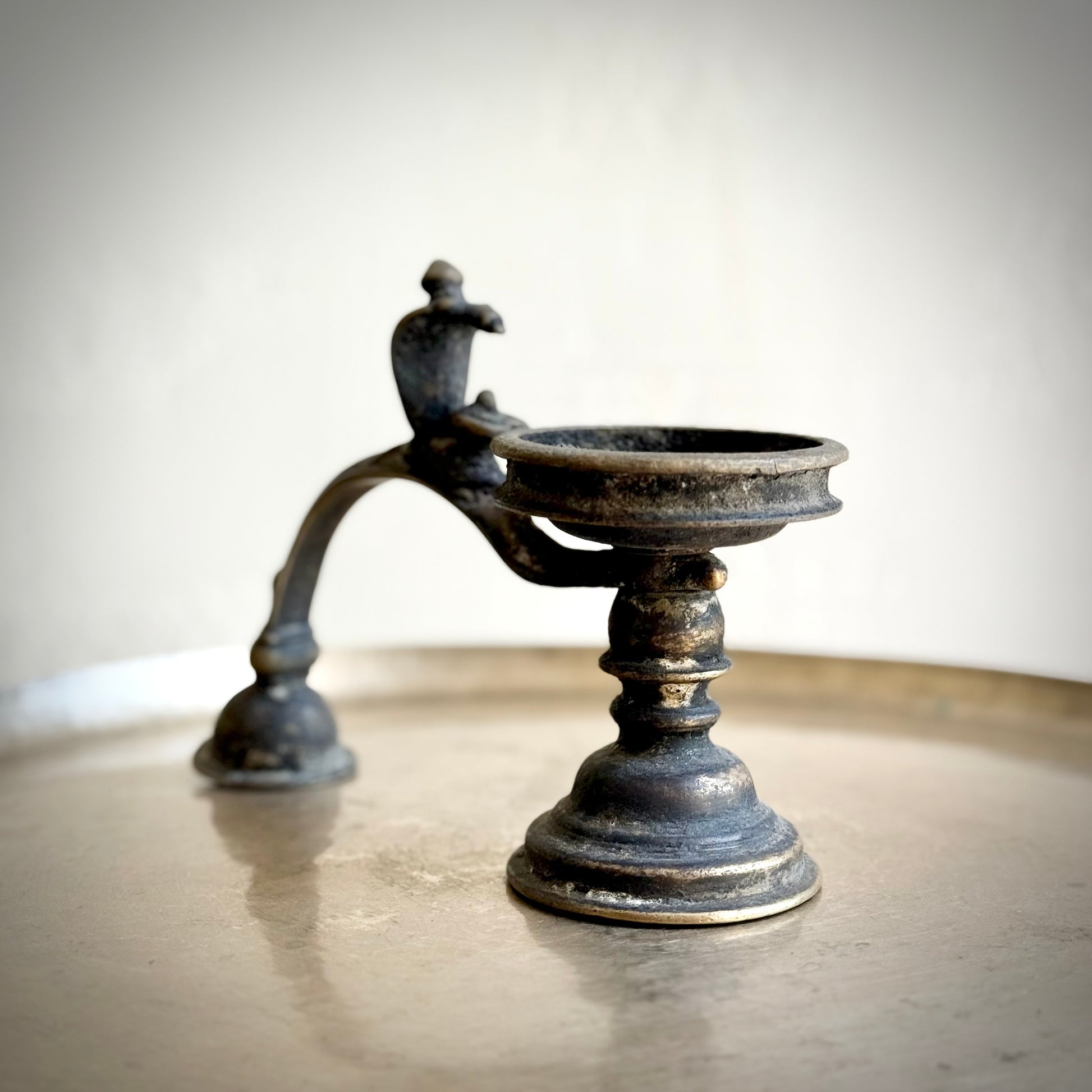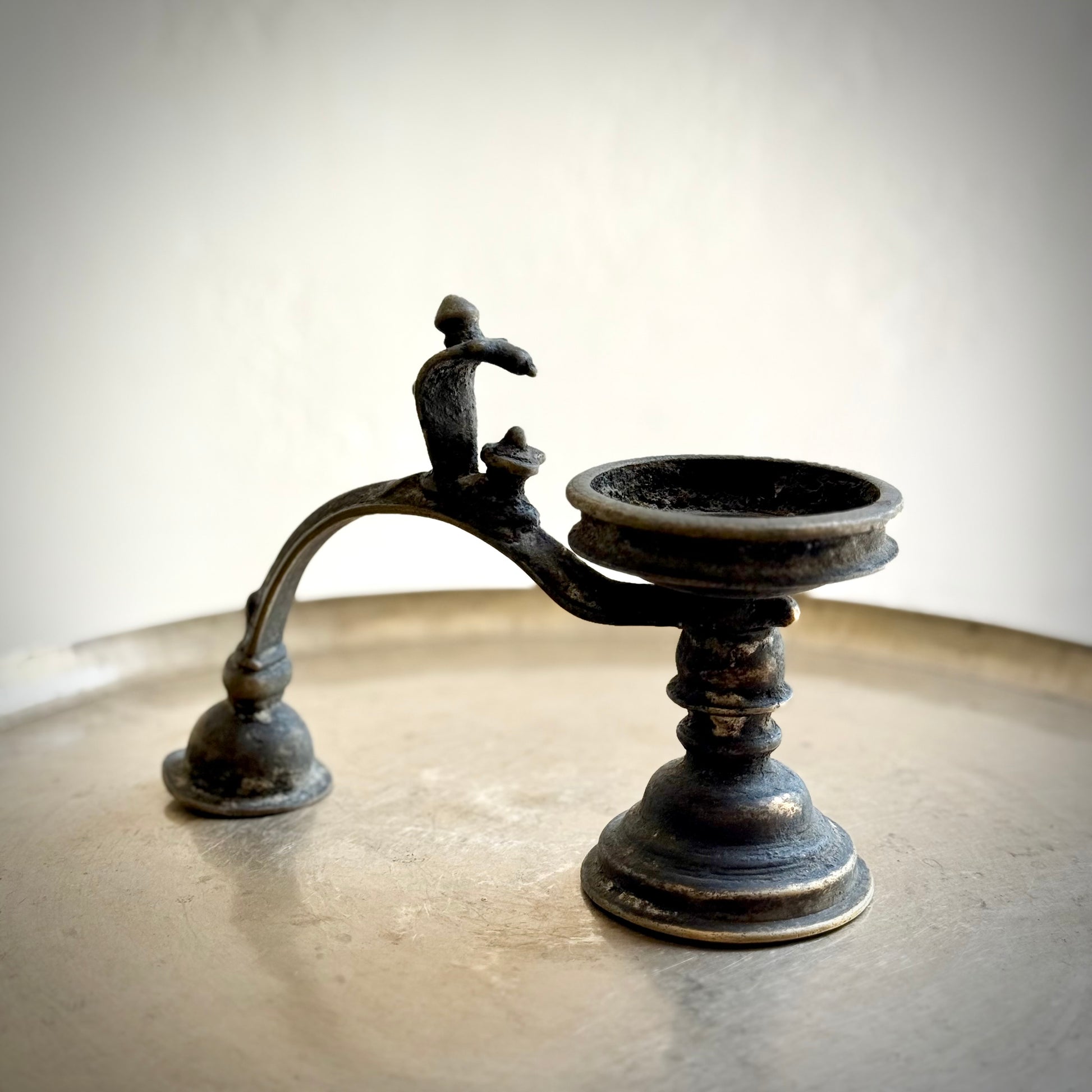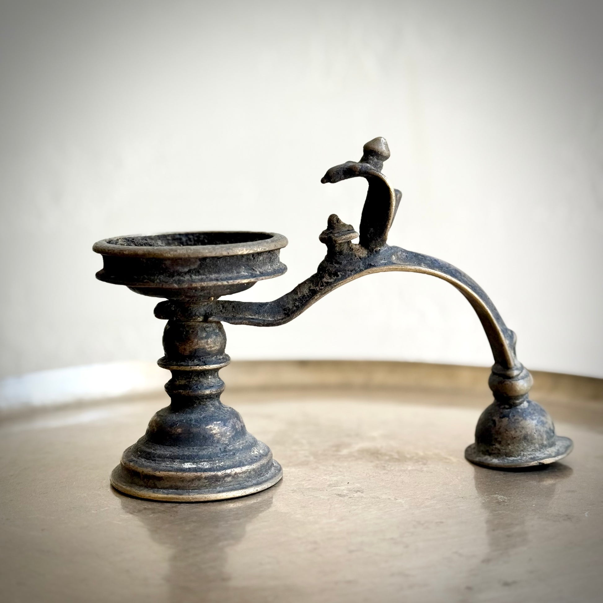 An exceptional vintage collectible, this bronze arti holder depicts Lord Shiva seated with a protective naga serpent gracefully arched along the handle. The naturally aged patina lends it an evocative presence, carrying with it both spiritual depth and a sense of timeless heritage.