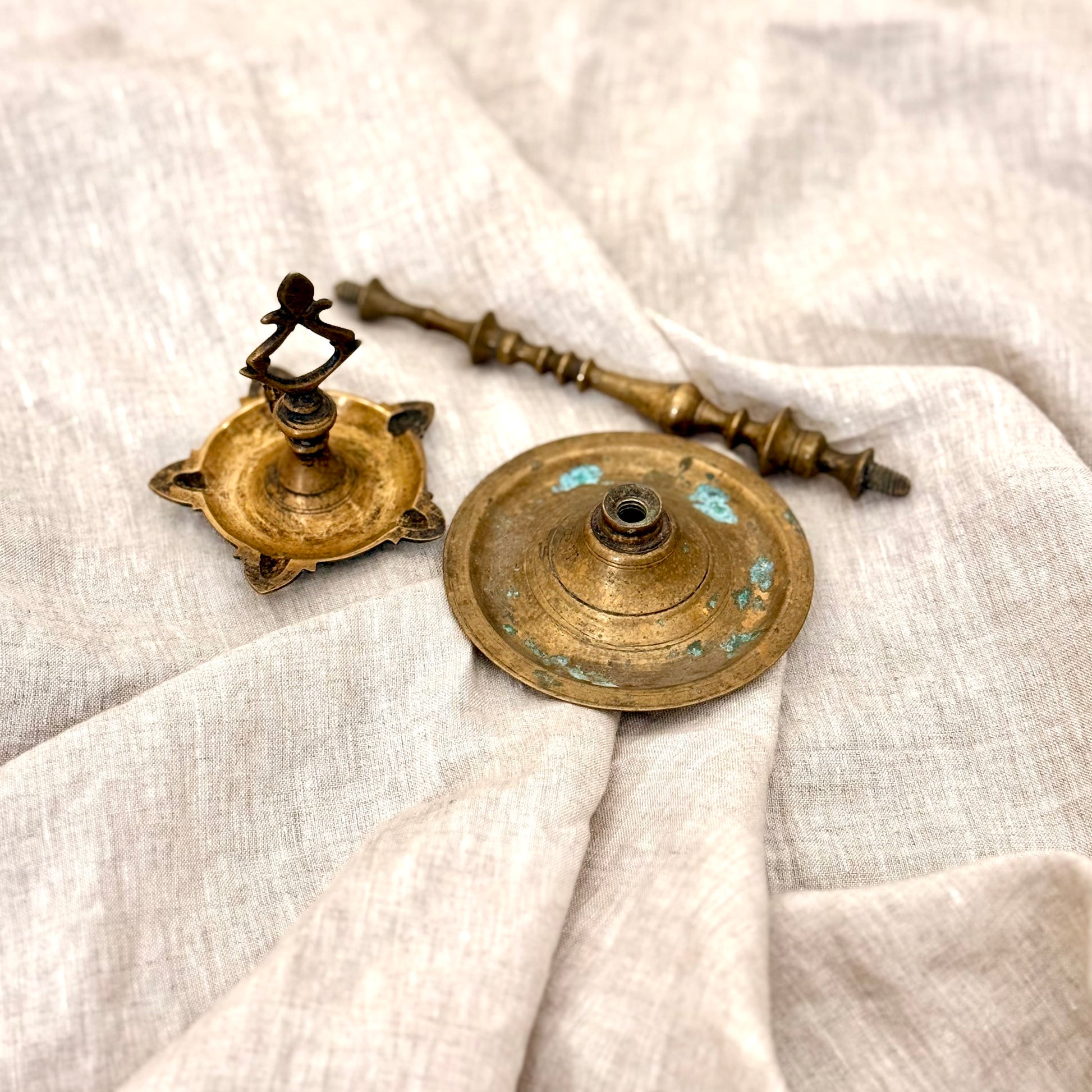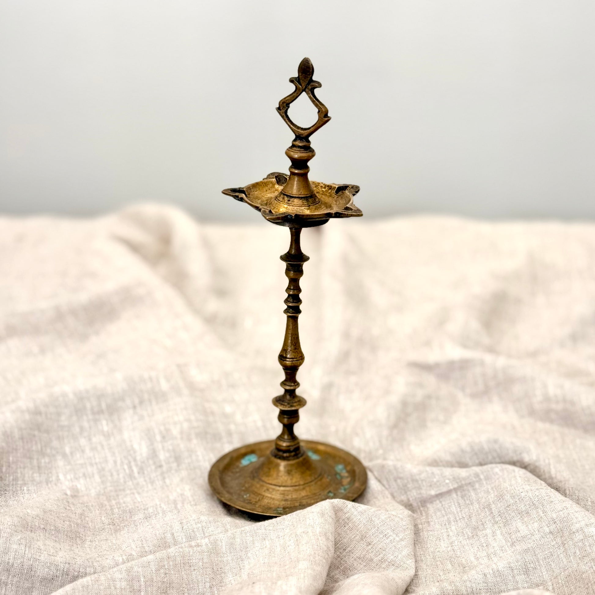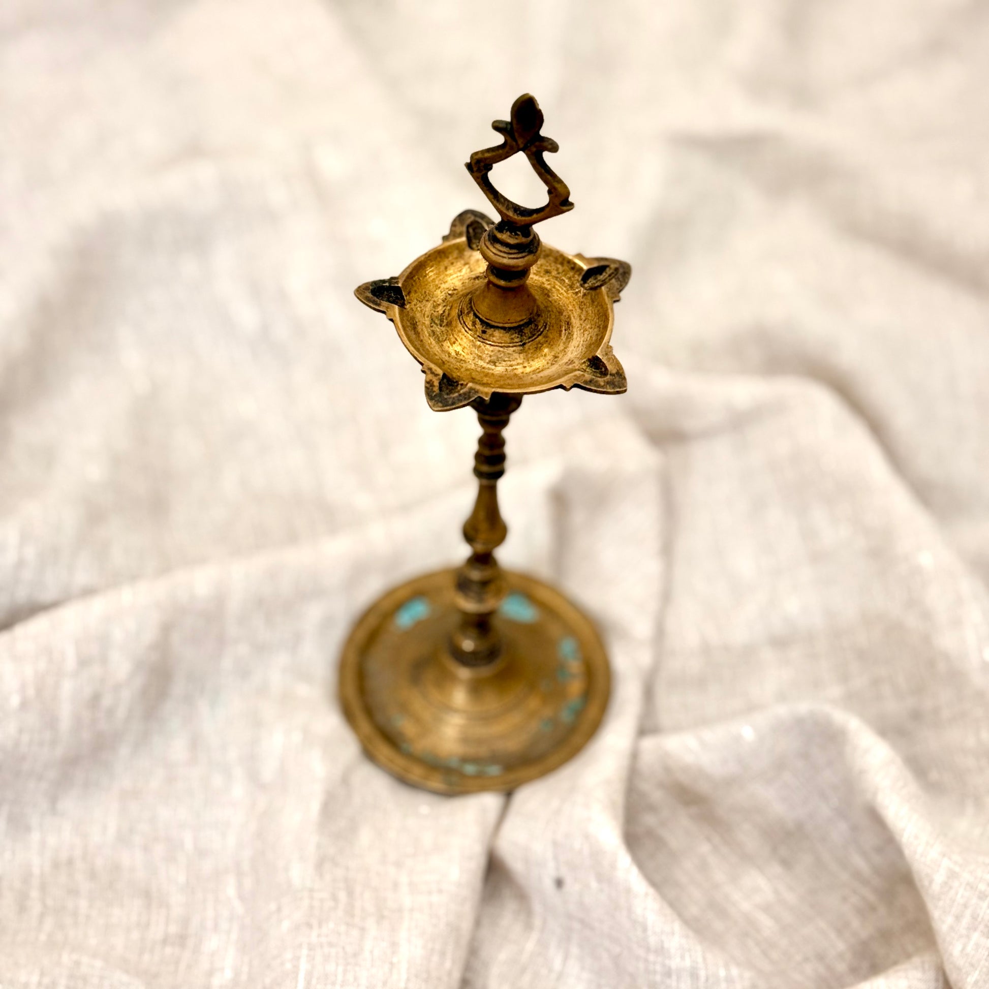 Each curve and contour bears the subtle patina of age, telling stories of rituals and festive evenings long past. Whether placed at the entrance, altar, or console table, this vintage lamp adds a quiet radiance and a sense of reverence to any setting.