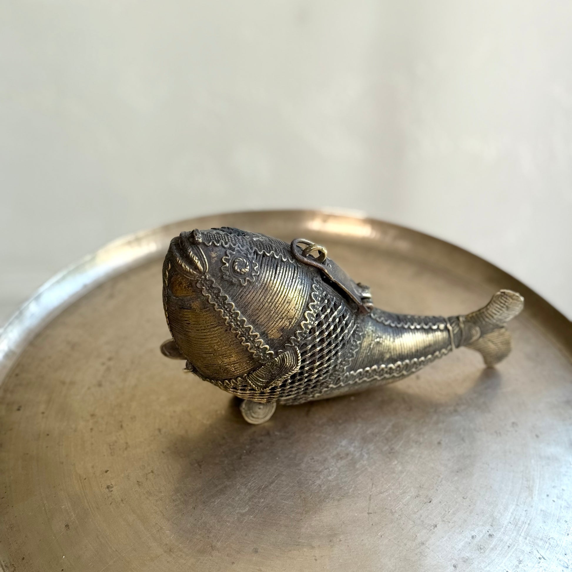 This exquisite vintage Dhokra fish is a stunning example of India’s age-old metalcraft tradition. Handcrafted from a brass alloy using the ancient lost-wax casting method, this piece carries the distinctive woven texture and intricate details characteristic of Dhokra art.