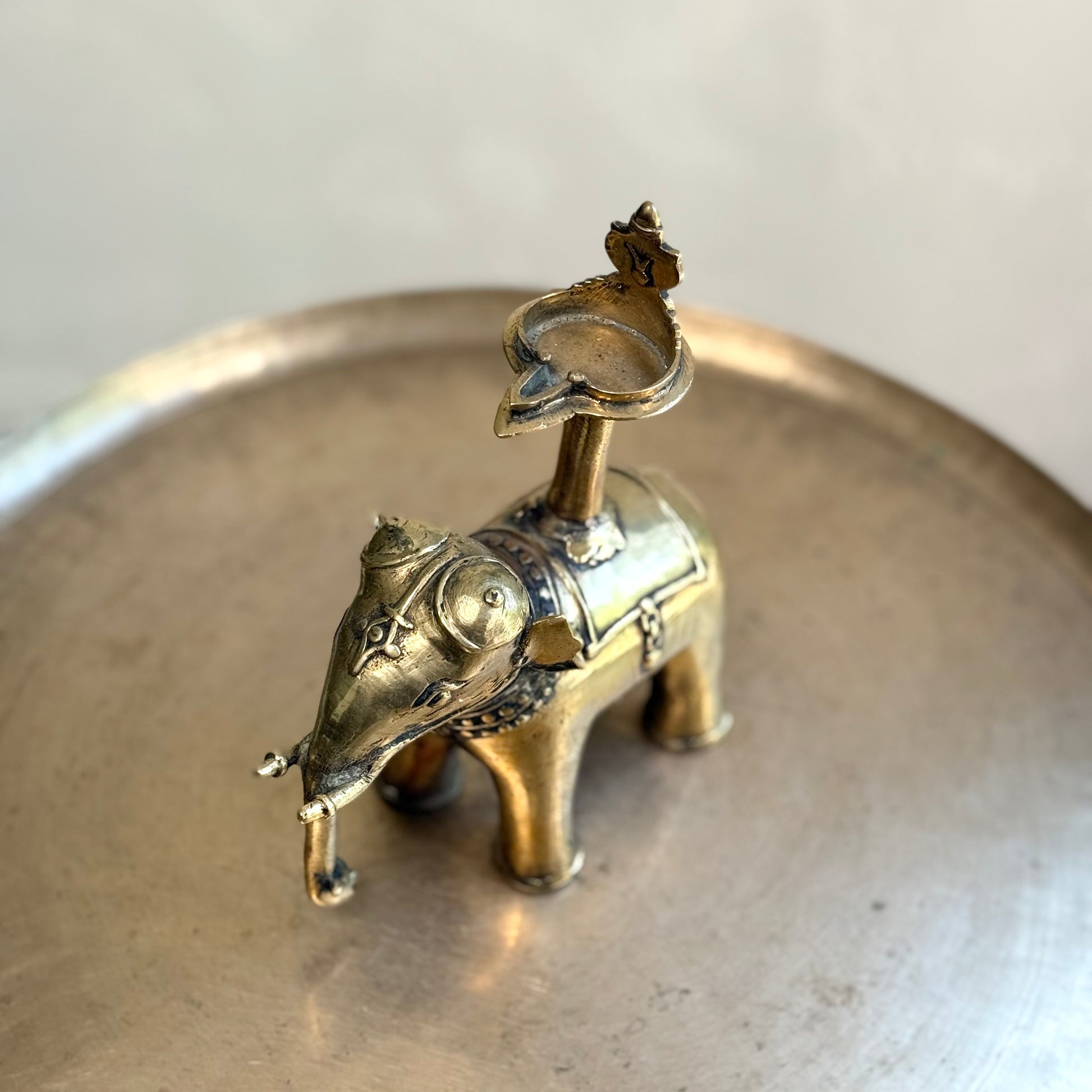 A strikingly rare find from Tamil Nadu, this antique hollow cast brass lamp features a beautifully detailed elephant with a Vishnu Vilakku perched gracefully on its back. The elephant is adorned with delicate embellishments and a charmingly elongated trunk, while the tall central column elegantly holds the oil lamp, symbolizing divinity and protection.