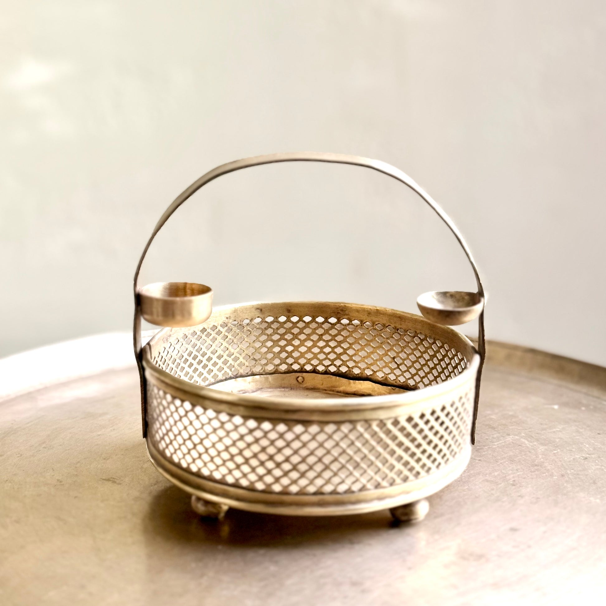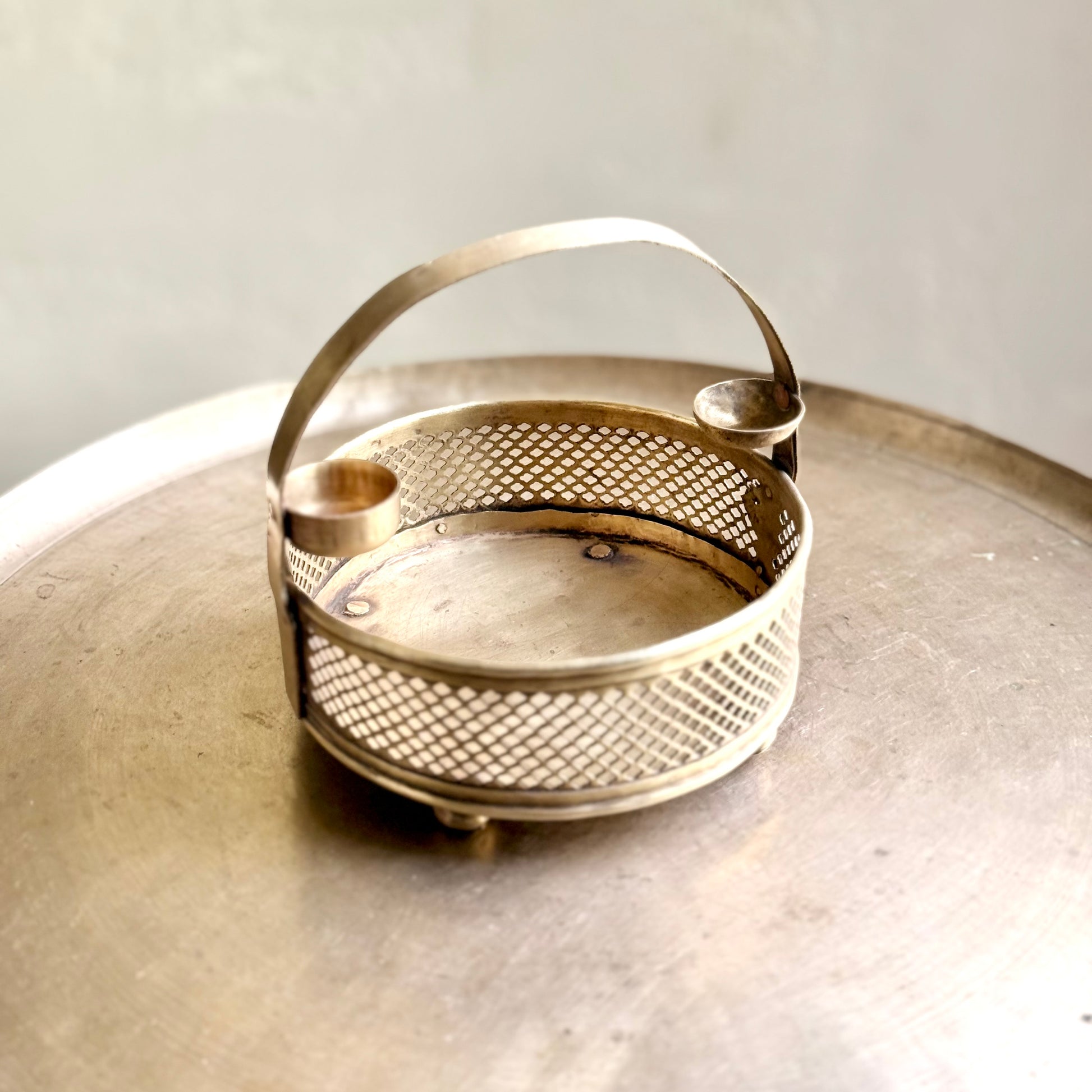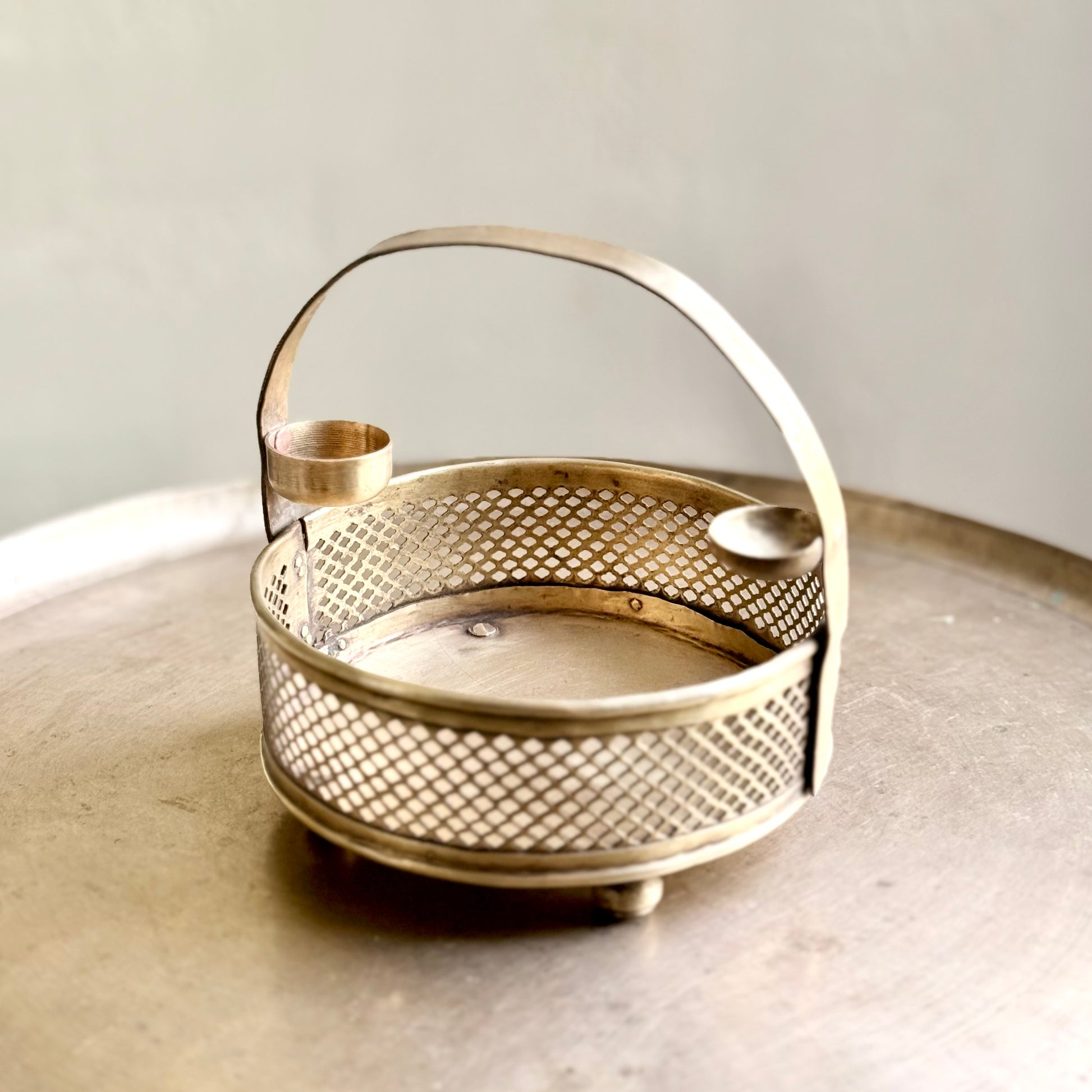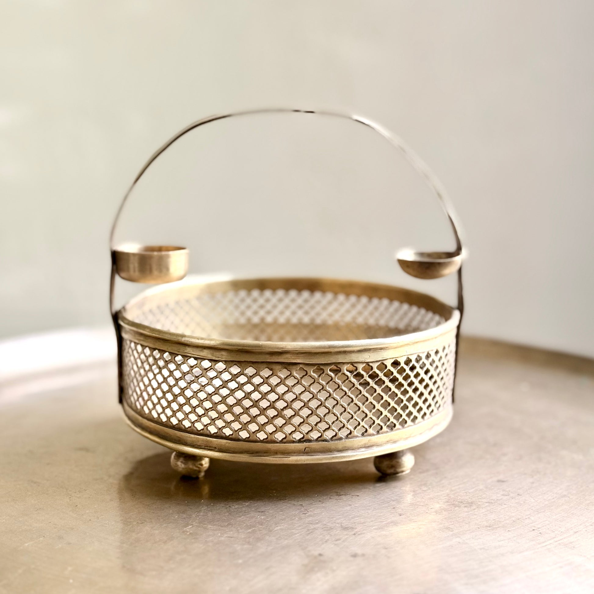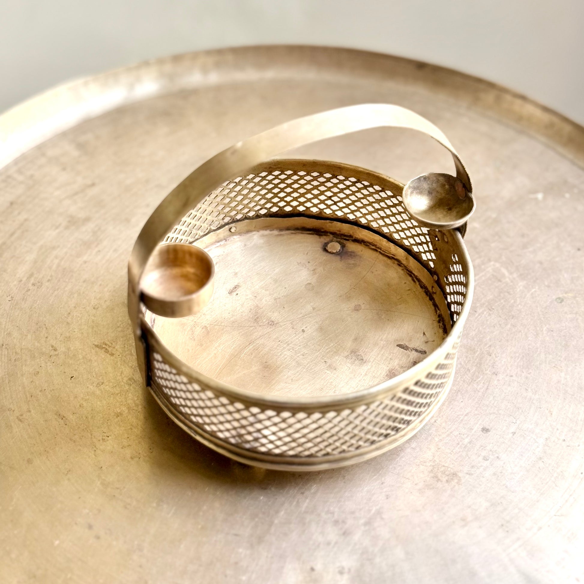 Bring home a piece of timeless tradition with this elegant round brass flower basket, a handcrafted treasure with over 60 years of history from South India. Known for its graceful proportions and delicate lattice jaaliwork, this piece reflects the artistry and spiritual significance of vintage Indian craftsmanship.