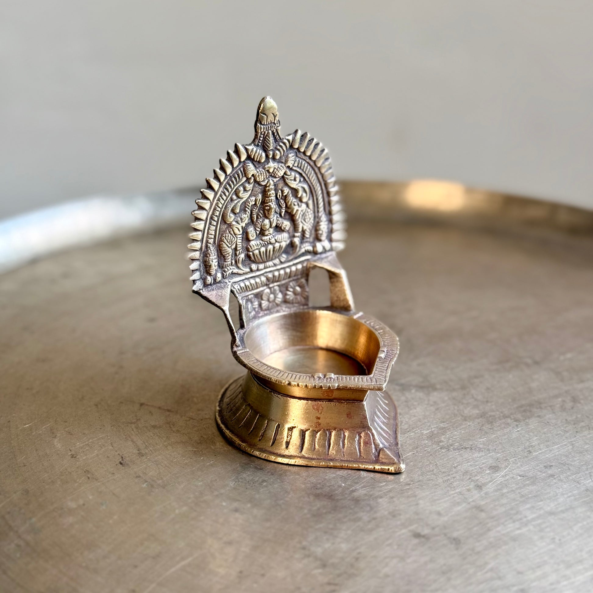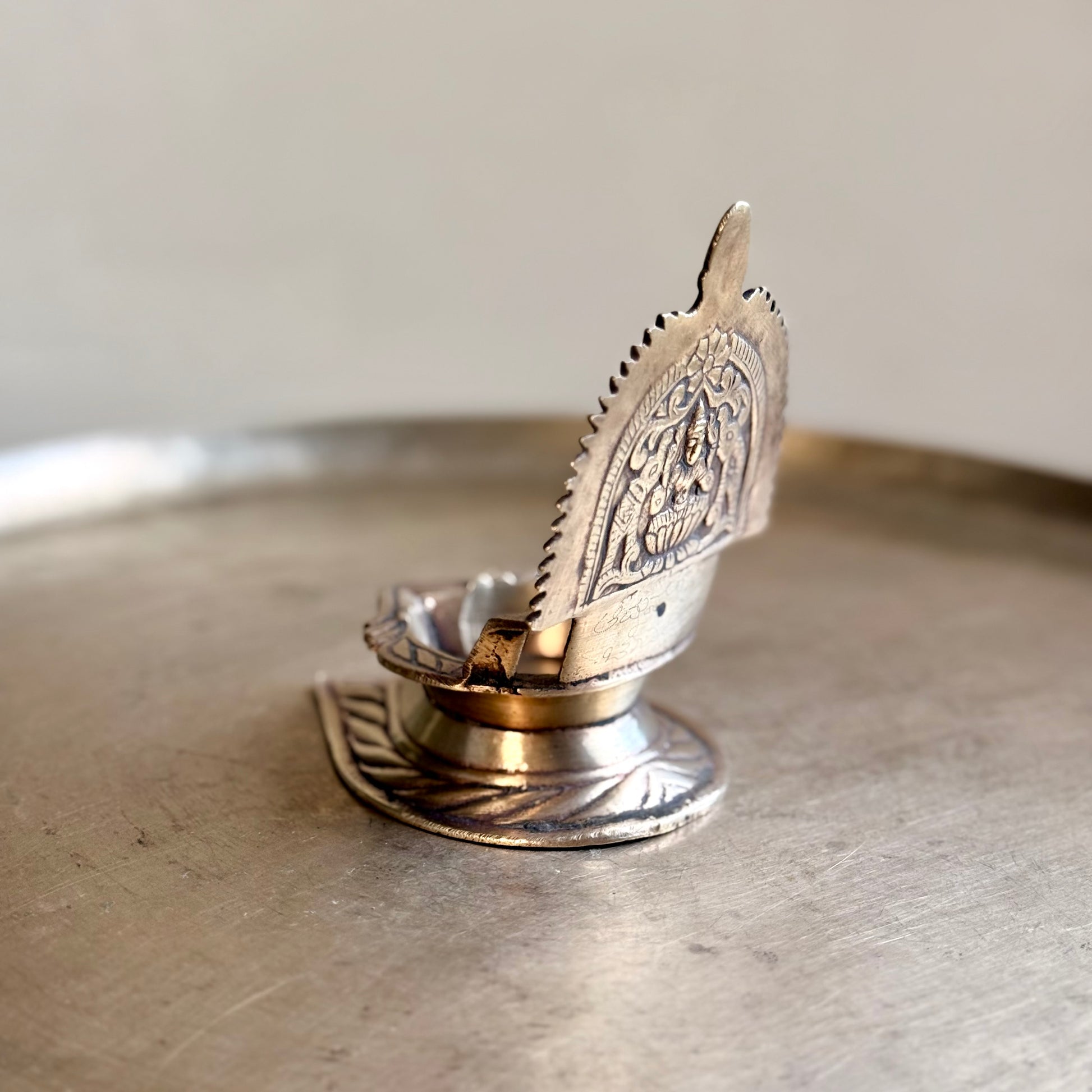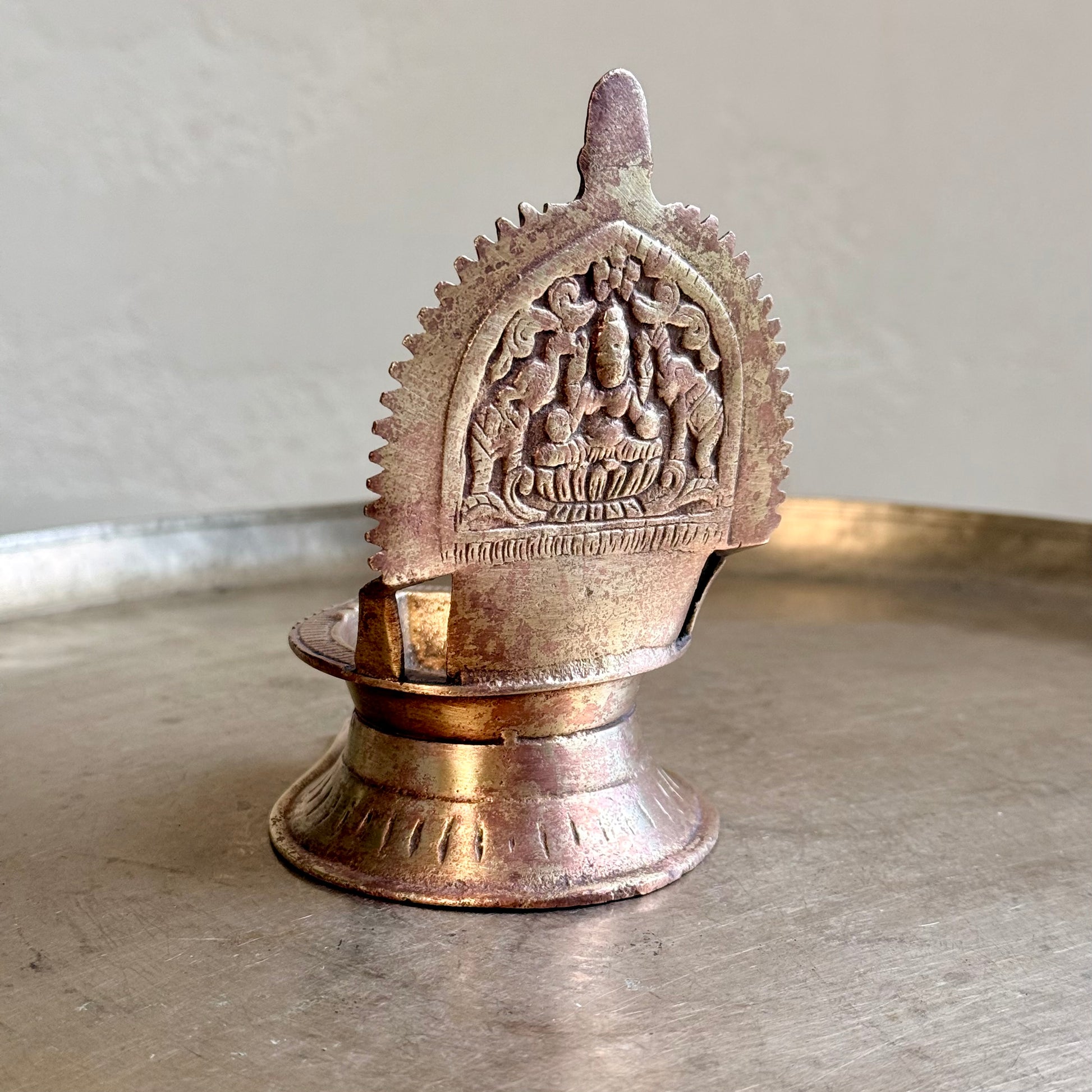 This vintage Gajalakshmi deepam, crafted with timeless artistry and cherished for its divine grace. The goddess Lakshmi, depicted in her revered Gajalakshmi form, is seated gracefully on a fully bloomed lotus, symbolizing prosperity and abundance. She is flanked by two majestic elephants on either side, a traditional motif that enhances its spiritual significance. The lamp is intricately engraved on both the front and back.