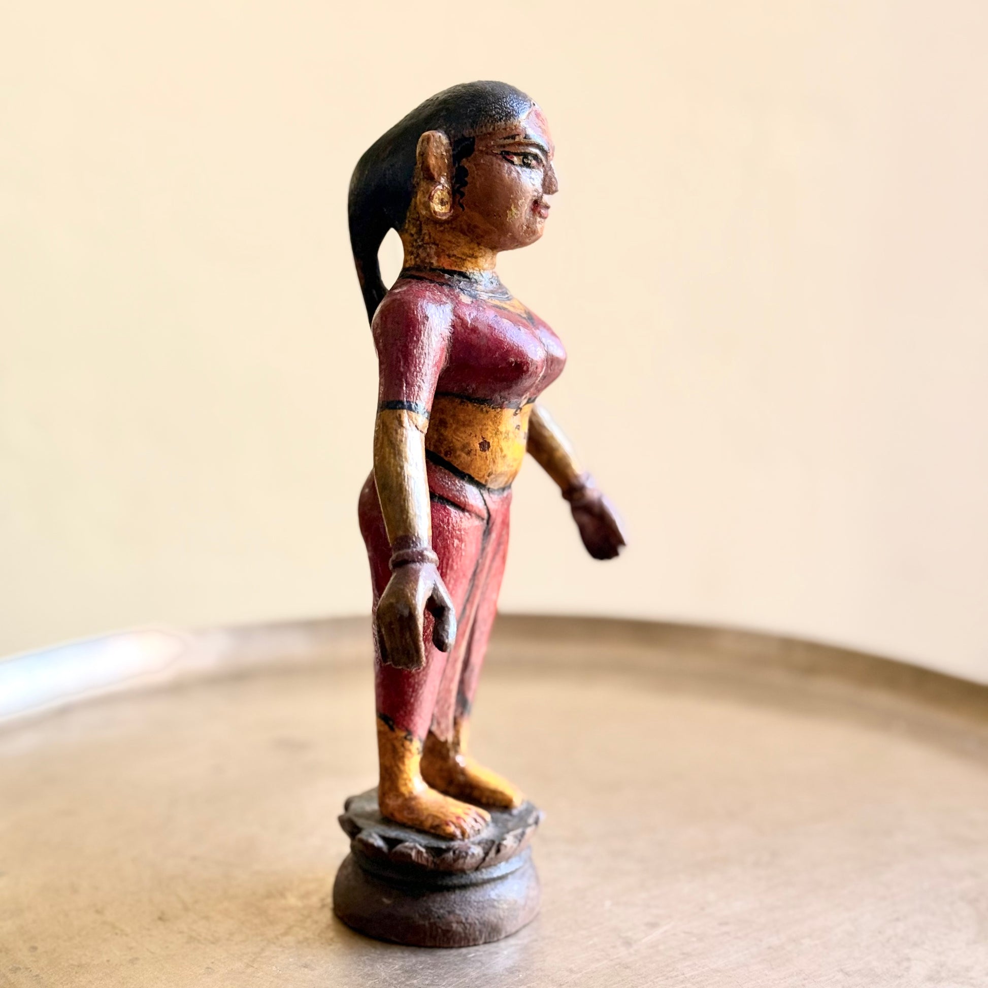 A vintage Gangaur wooden doll, approximately 70 years old, hand-carved and traditionally hand-painted, representing the folk art associated with the Gangaur festival of Rajasthan. The figure reflects classic Rajasthani craftsmanship, with stylized facial features, and graceful proportions that echo depictions of Goddess Gauri and feminine elegance.