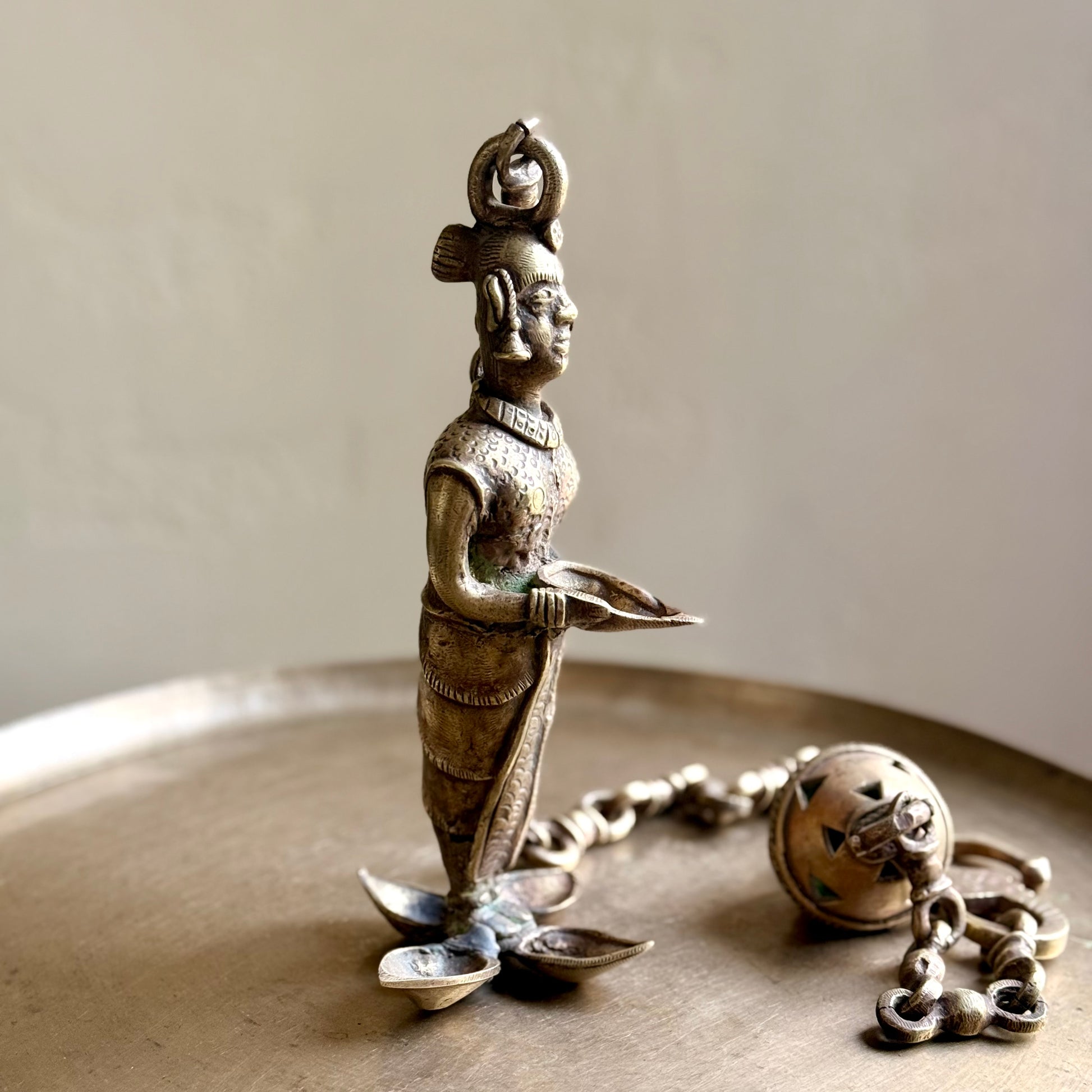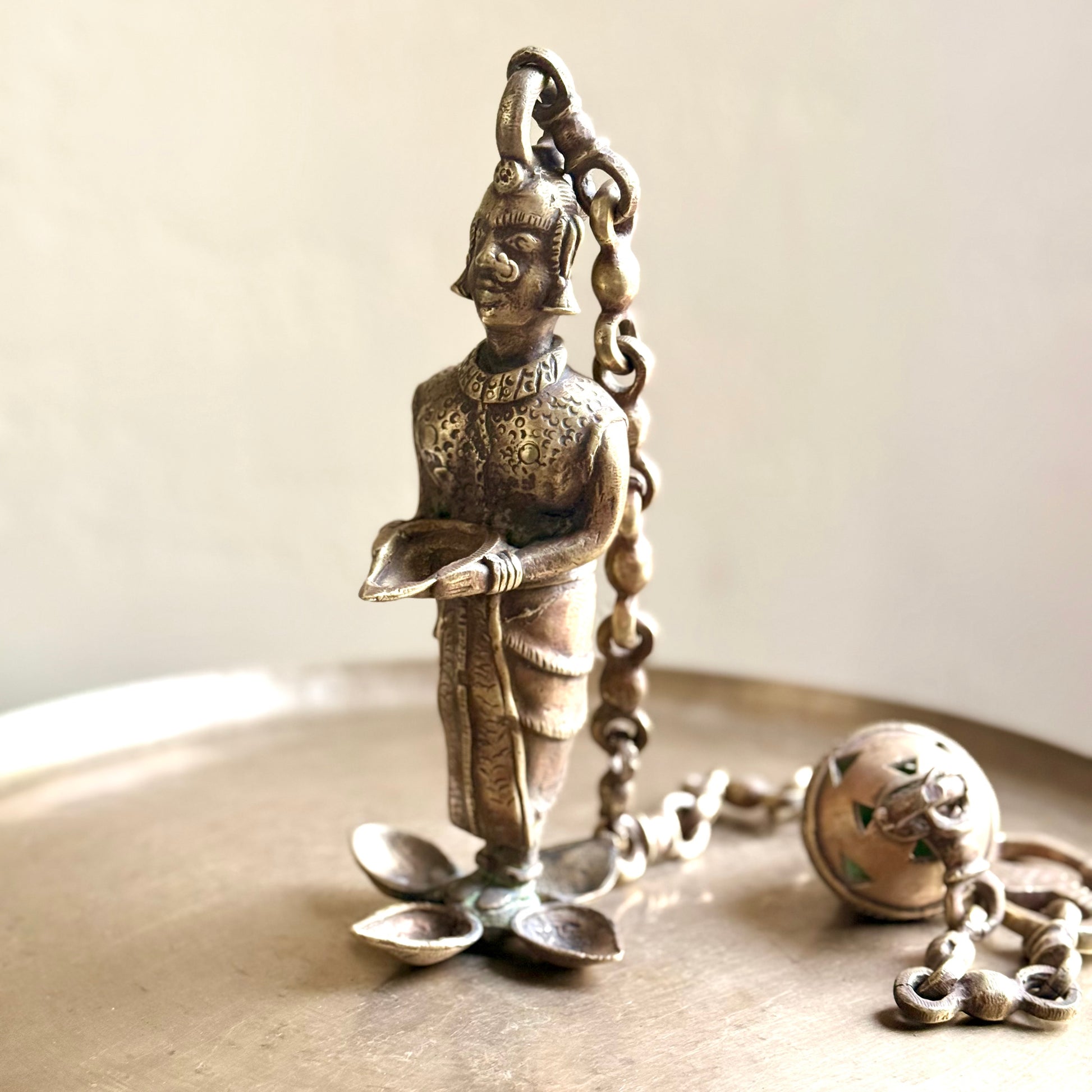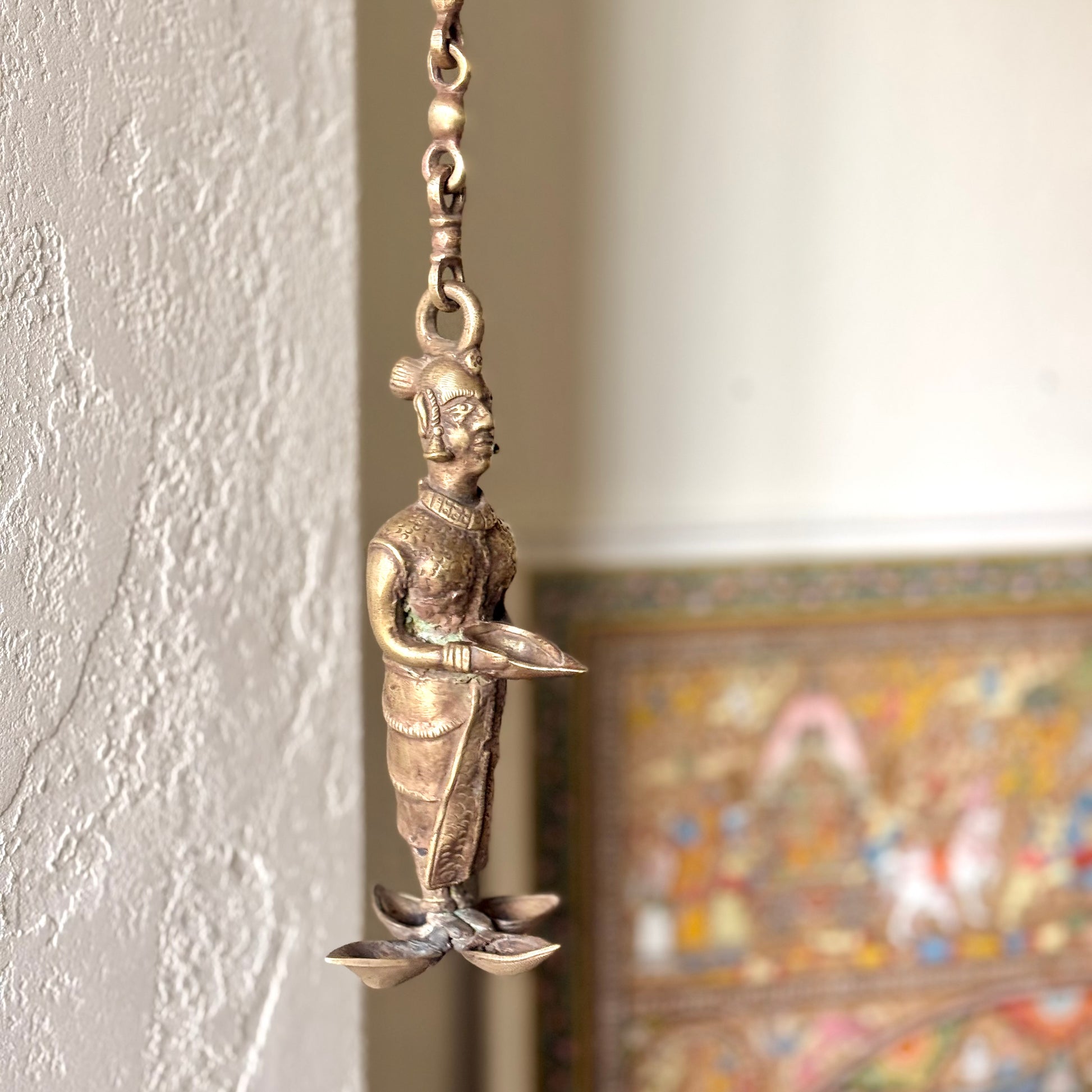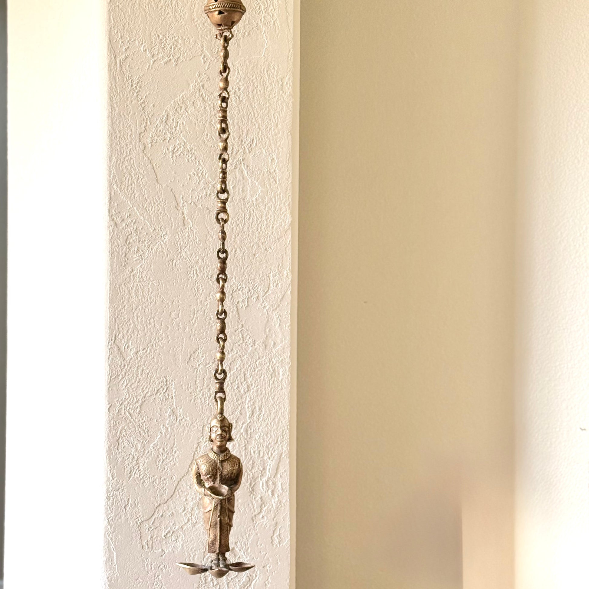 Suspended from a decorative chain, this piece works wonderfully as a hanging accent in a pooja room, verandah, living area, or near an entryway. The intricate craftsmanship—seen in the facial features, attire, and jewelry—reflects traditional Indian artistry and makes it a striking collectible.