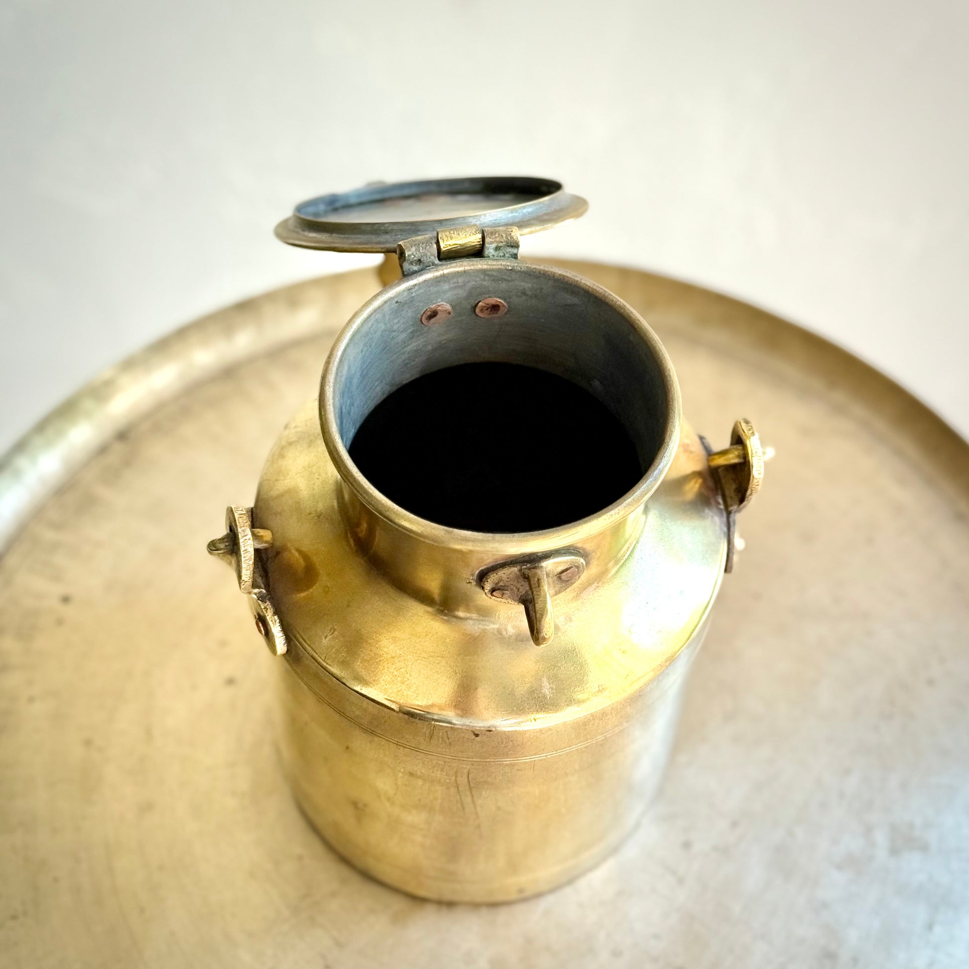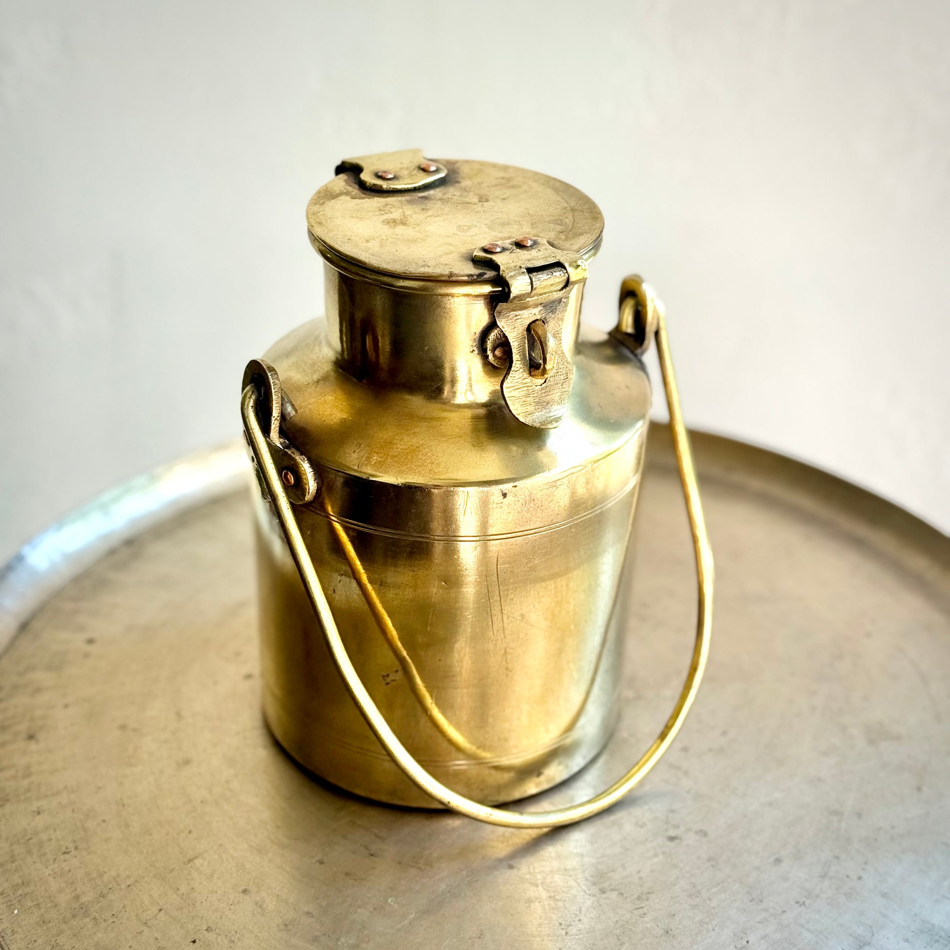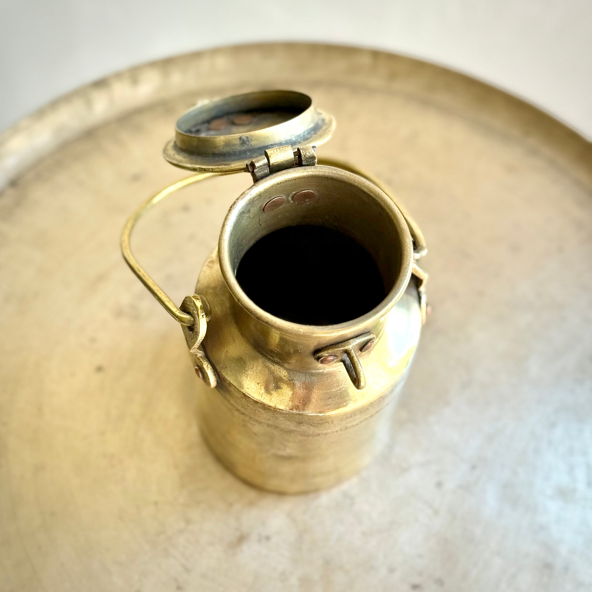 Introducing a rare and exquisite brass milk can, meticulously sourced from Rajasthan, India. This timeless piece is a true representation of traditional craftsmanship and utility. Its unique design features a secure locking mechanism, ensuring the contents remain safe during transportation, while the robust, ergonomically designed handle provides a firm grip, making it ideal for carrying.