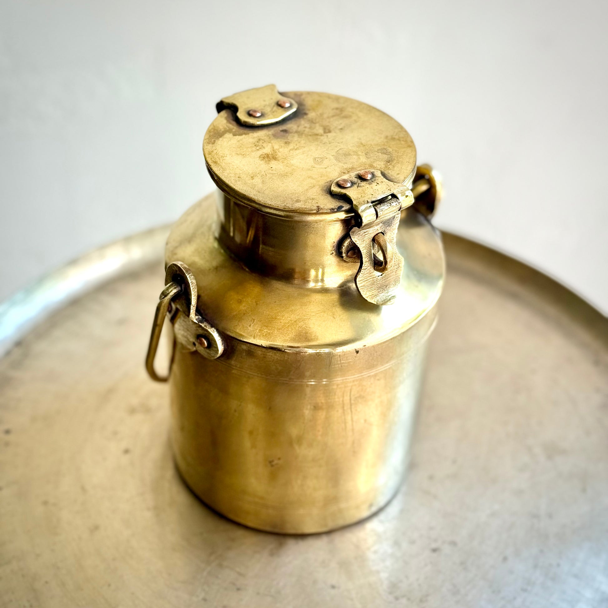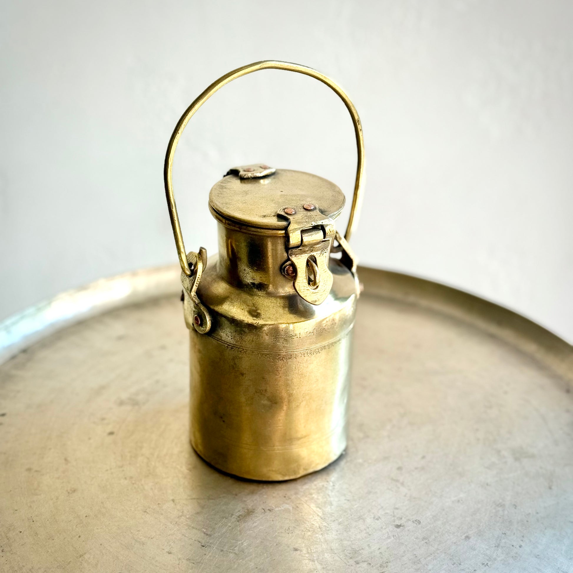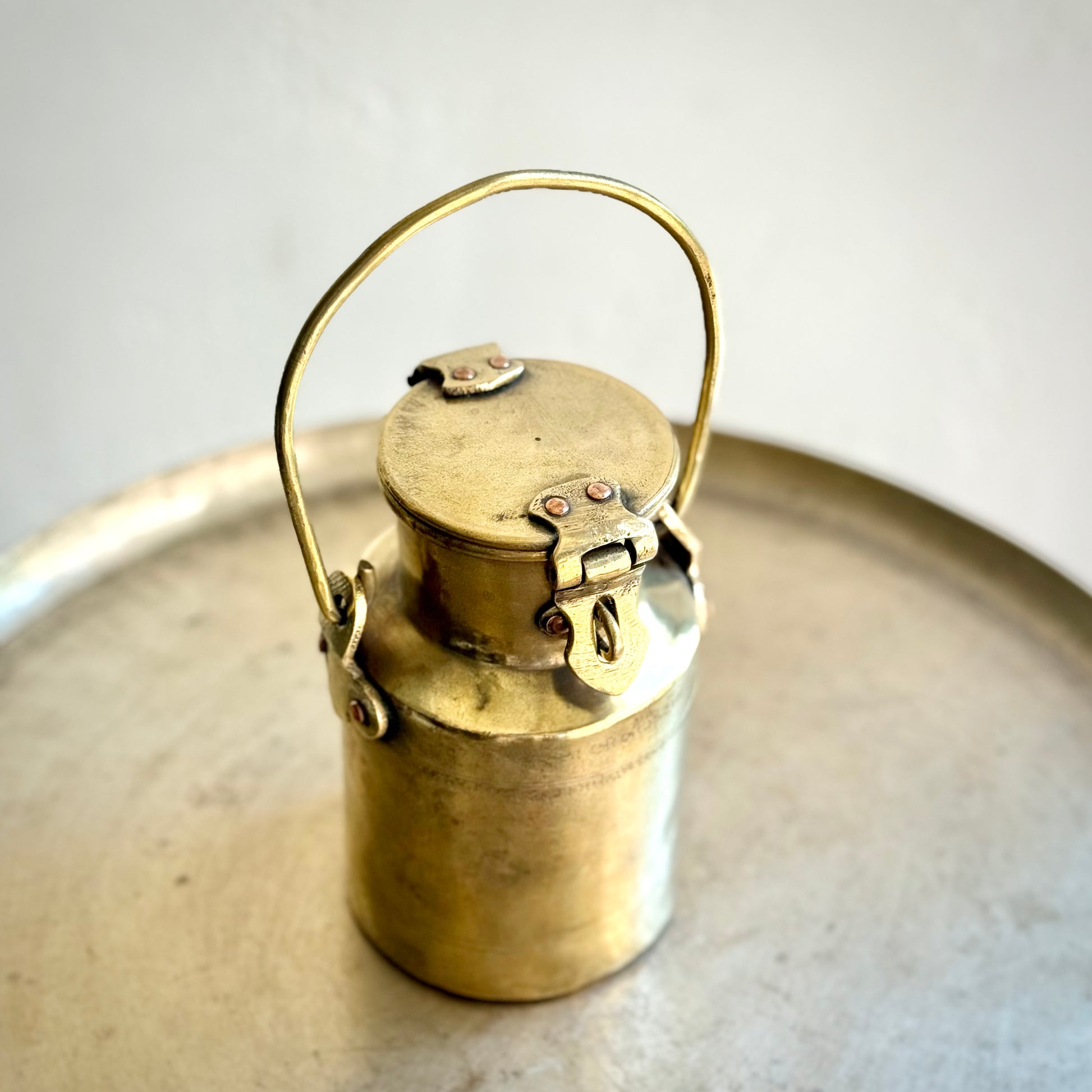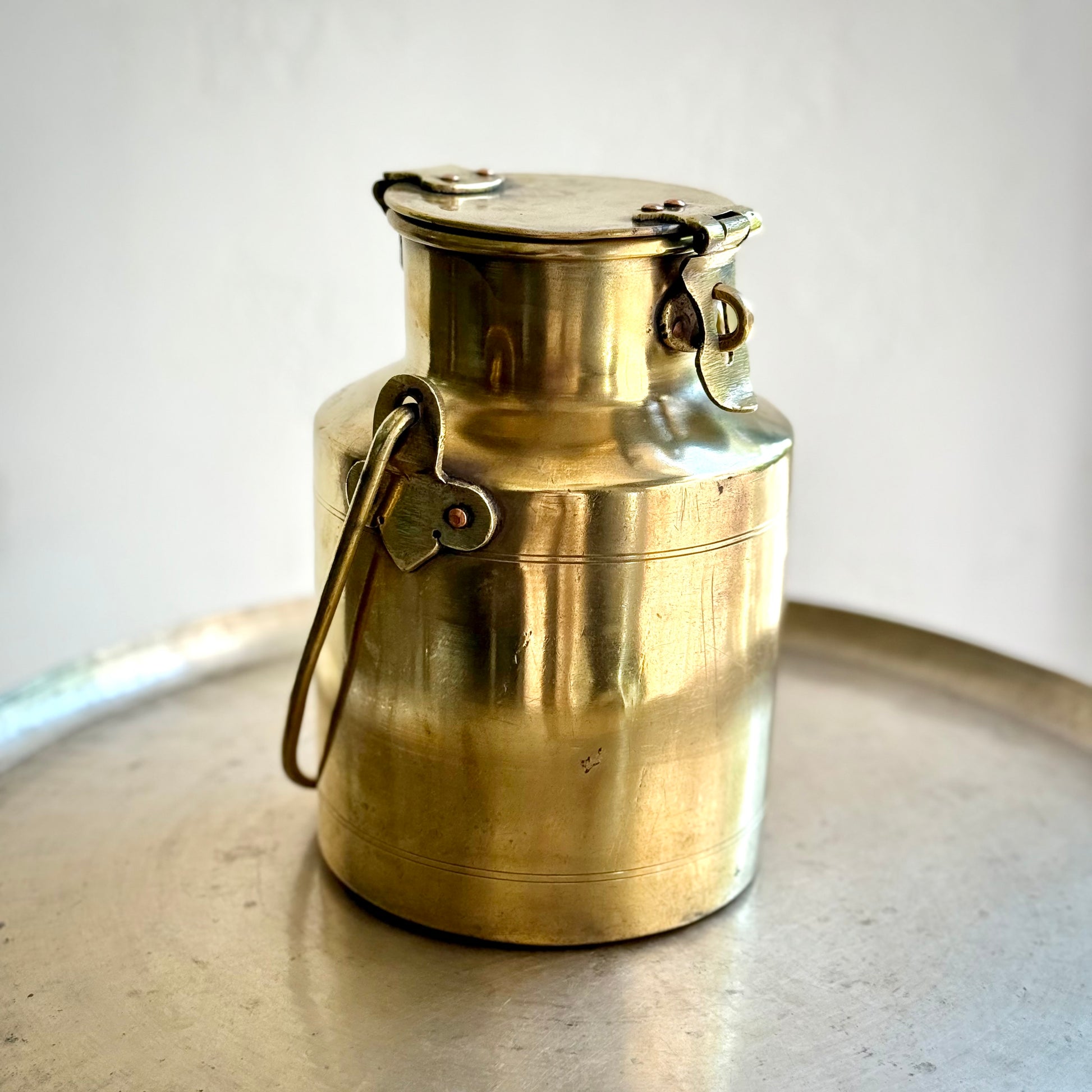 Introducing a rare and exquisite brass milk can, meticulously sourced from Rajasthan, India. This timeless piece is a true representation of traditional craftsmanship and utility. Its unique design features a secure locking mechanism, ensuring the contents remain safe during transportation, while the robust, ergonomically designed handle provides a firm grip, making it ideal for carrying.