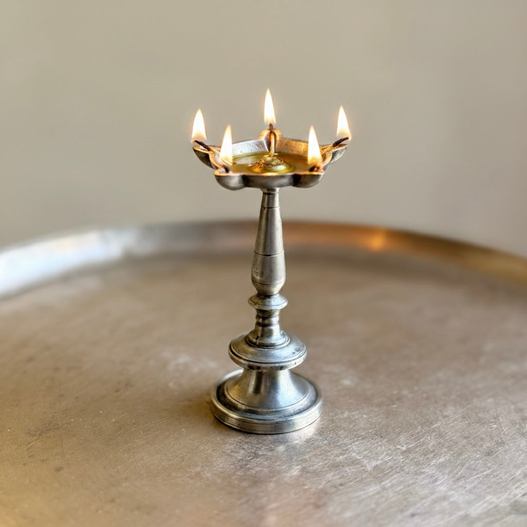 Designed for daily rituals or as a meaningful accent for festive gatherings, its compact silhouette allows it to fit seamlessly onto a meditation altar, a wooden console, or a quiet shelf. When lit, the five-wick arrangement radiates light in every direction, casting a warm, auspicious glow that instantly elevates the atmosphere of a room. This diya is not merely a lighting accessory but a curated piece of history that invites a peaceful, sacred energy into your living space.