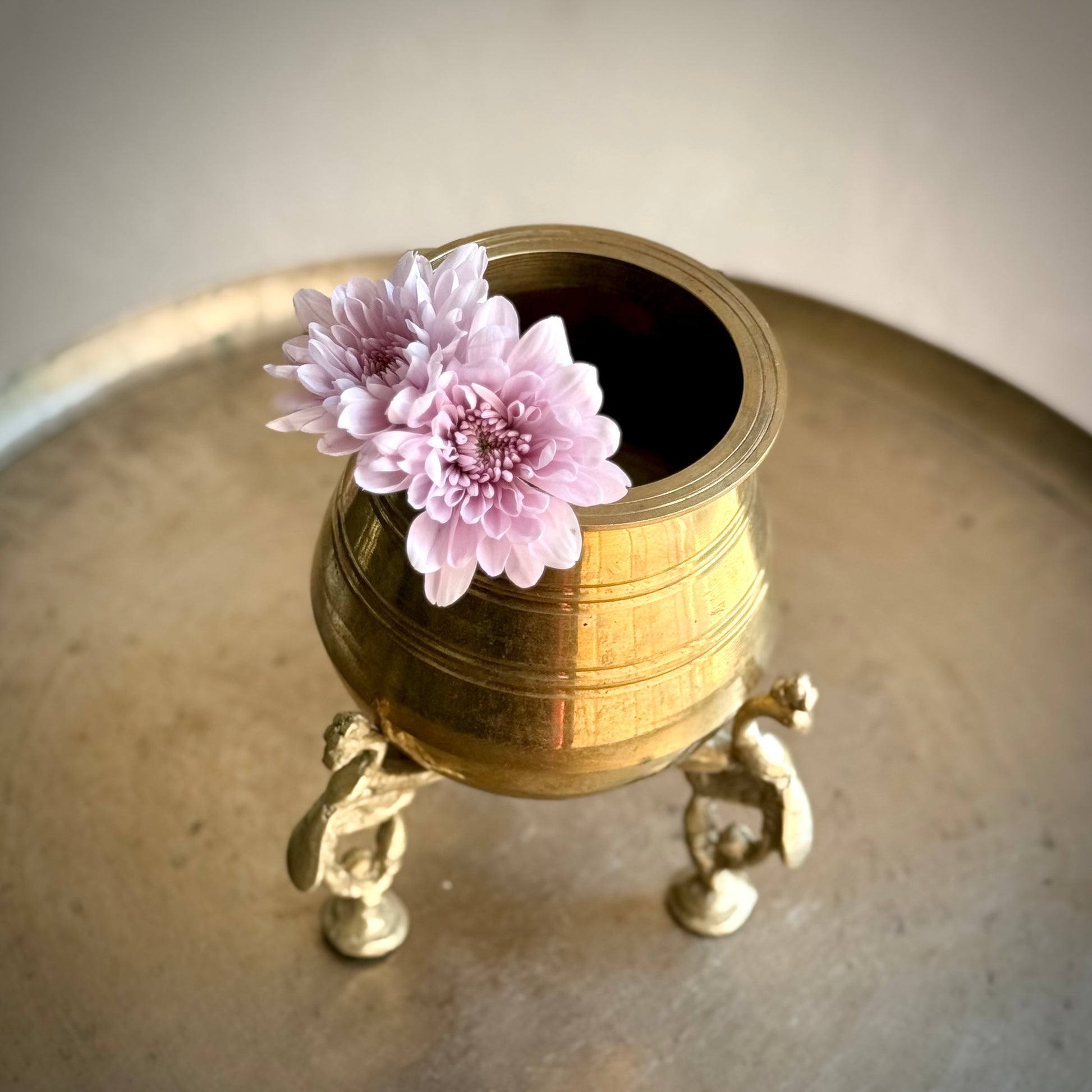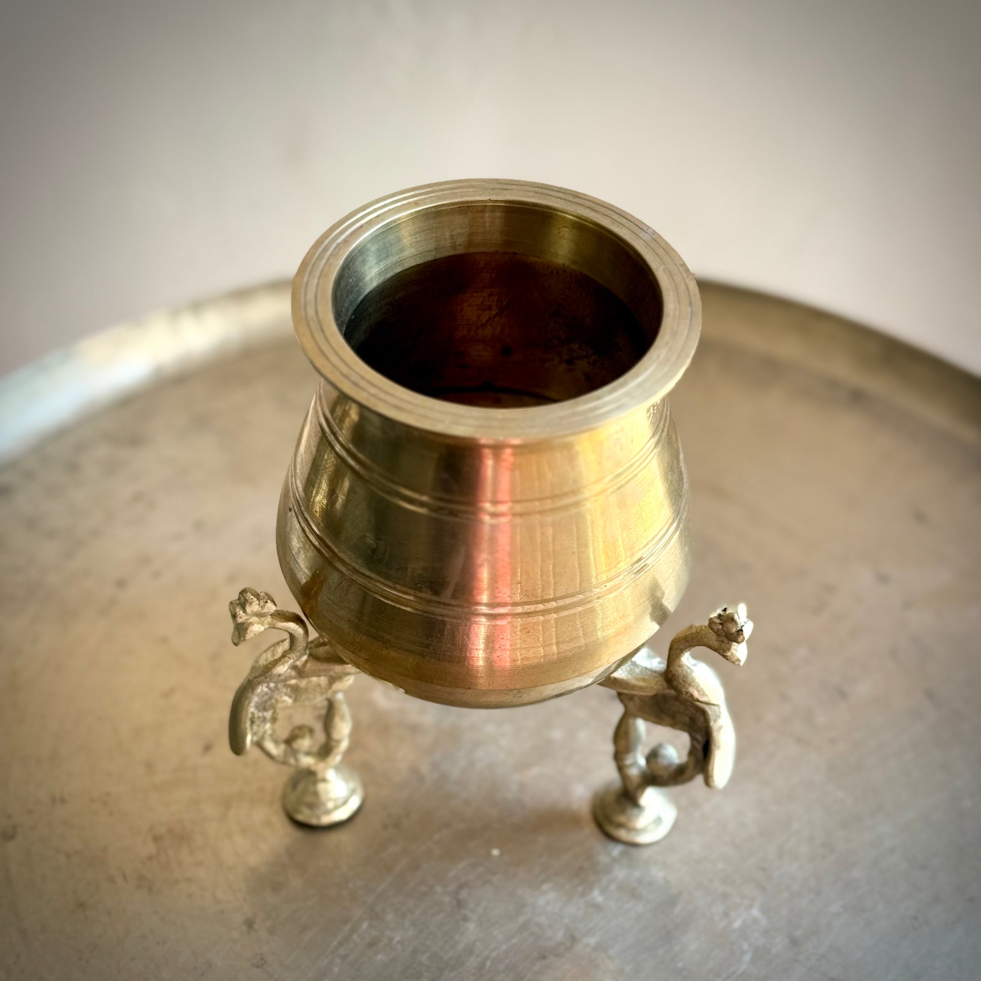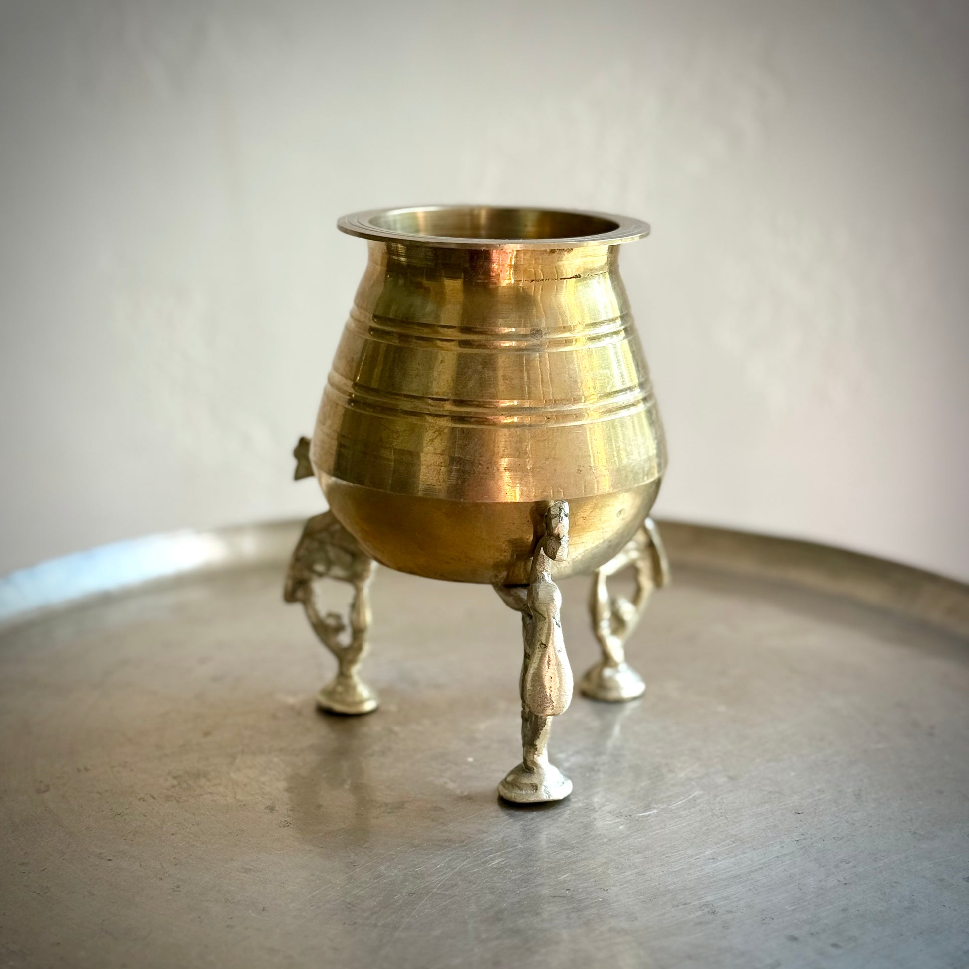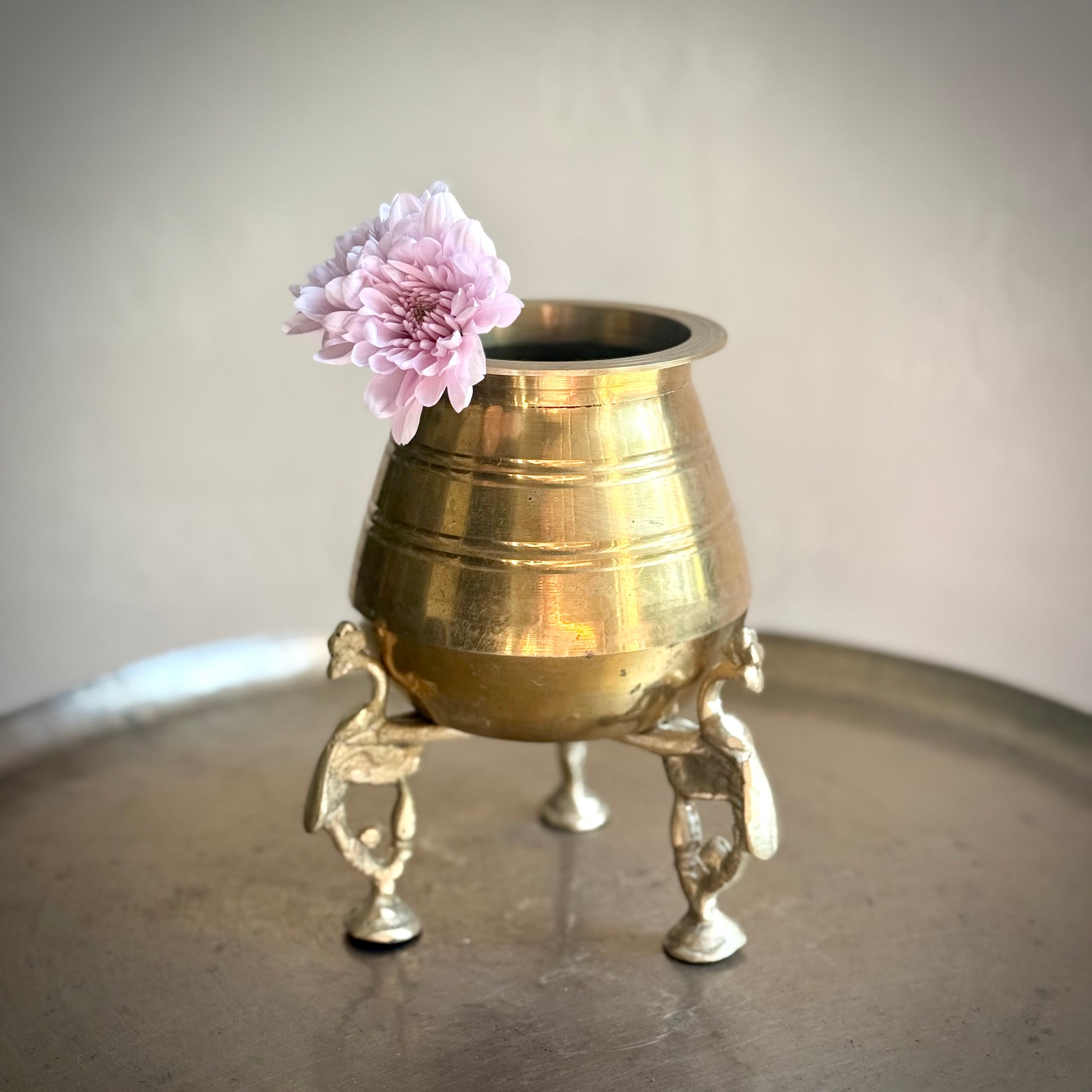 Introducing a gracefully elegant vintage brass pot, renowned for its captivating aesthetic allure. This delightful piece showcases a distinctive feature with three ornate parrot legs affixed to its base, elevating its stature and imparting a unique character. Beyond its traditional utility, this pot transforms into a captivating decor accent, infusing any space with a dash of vintage charm and sophistication. The meticulous craftsmanship and distinctive design make it a focal point that not only pleases the eye but also narrates a tale of artistry from a bygone era.