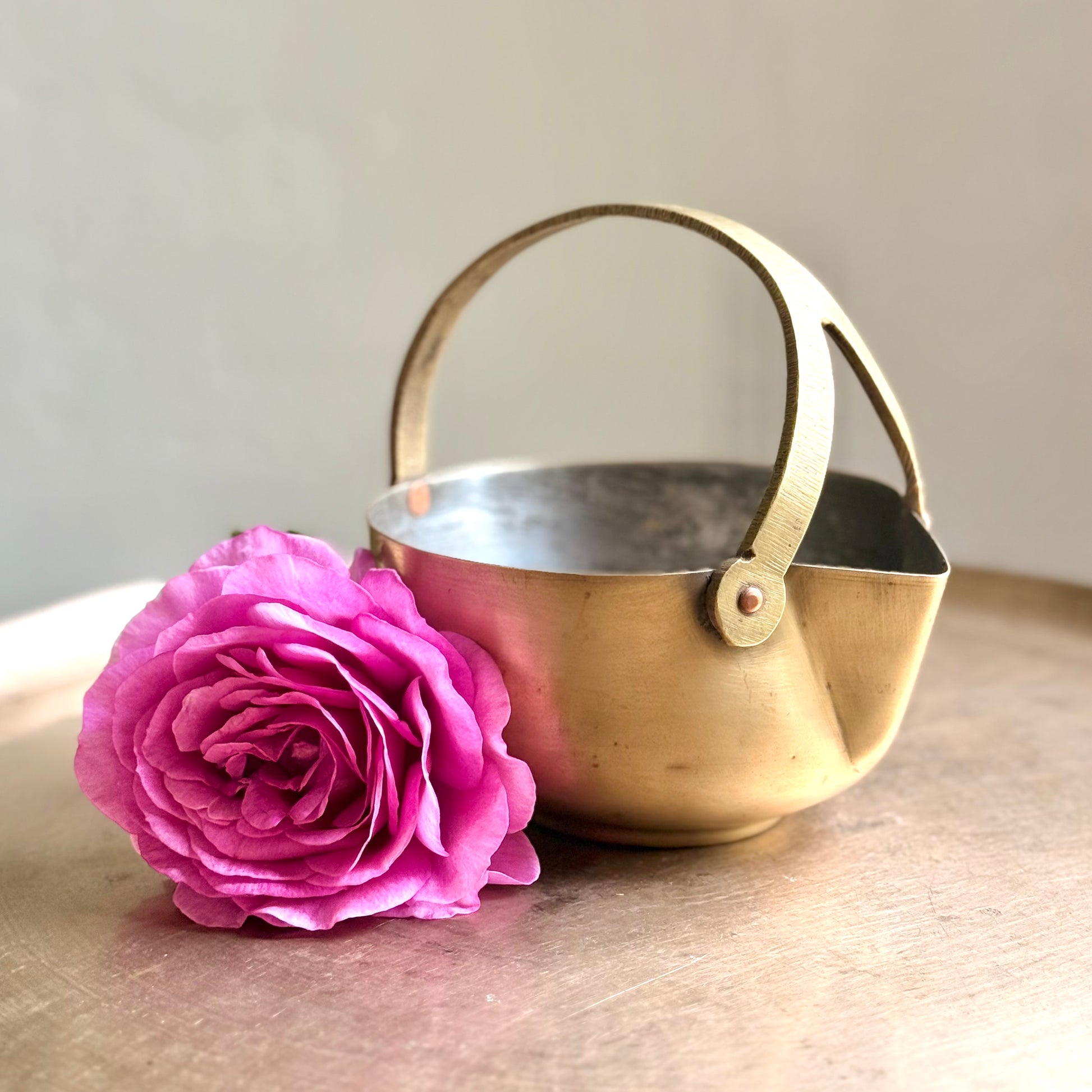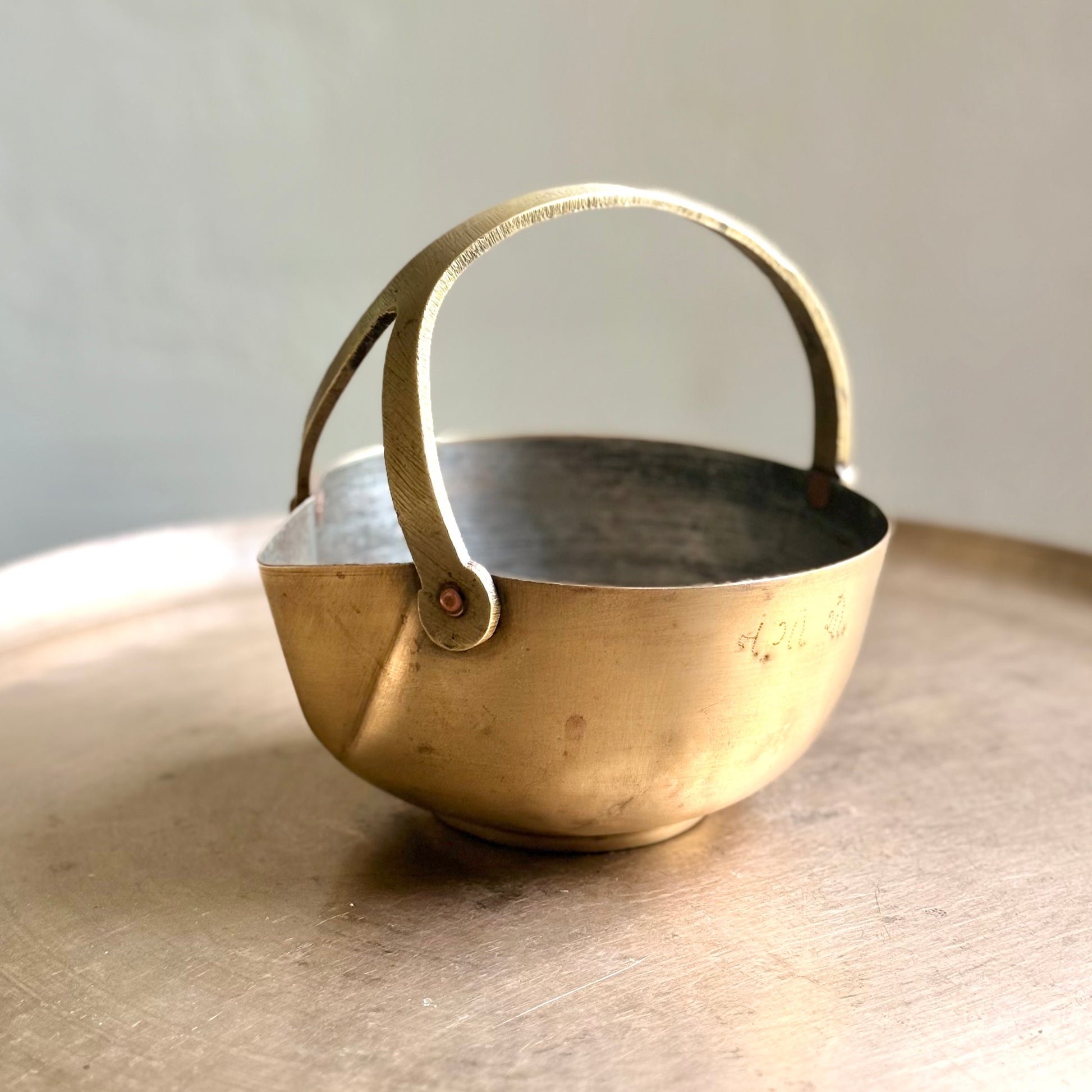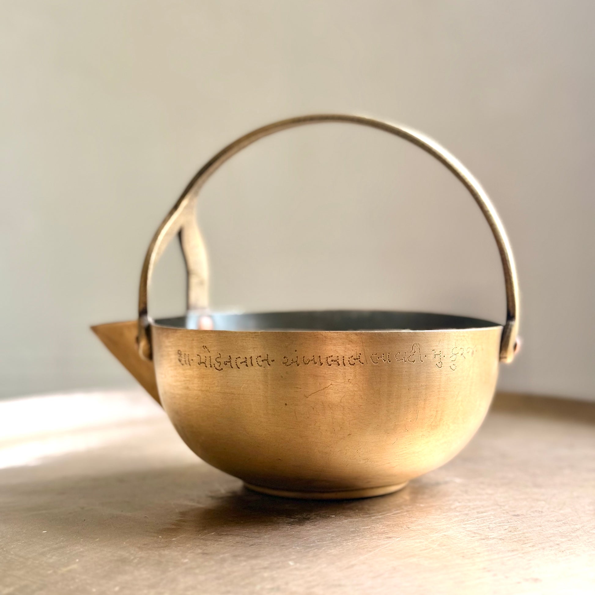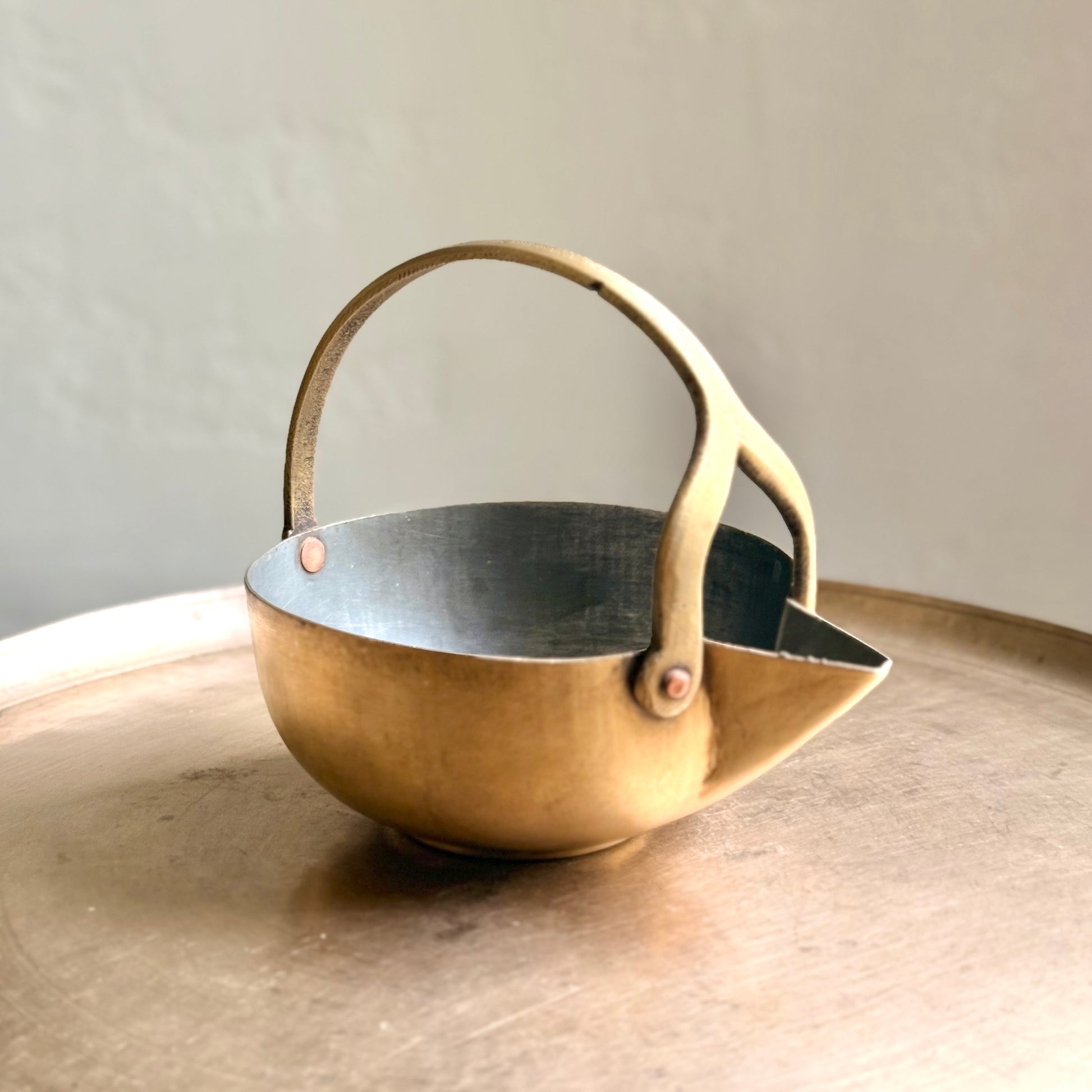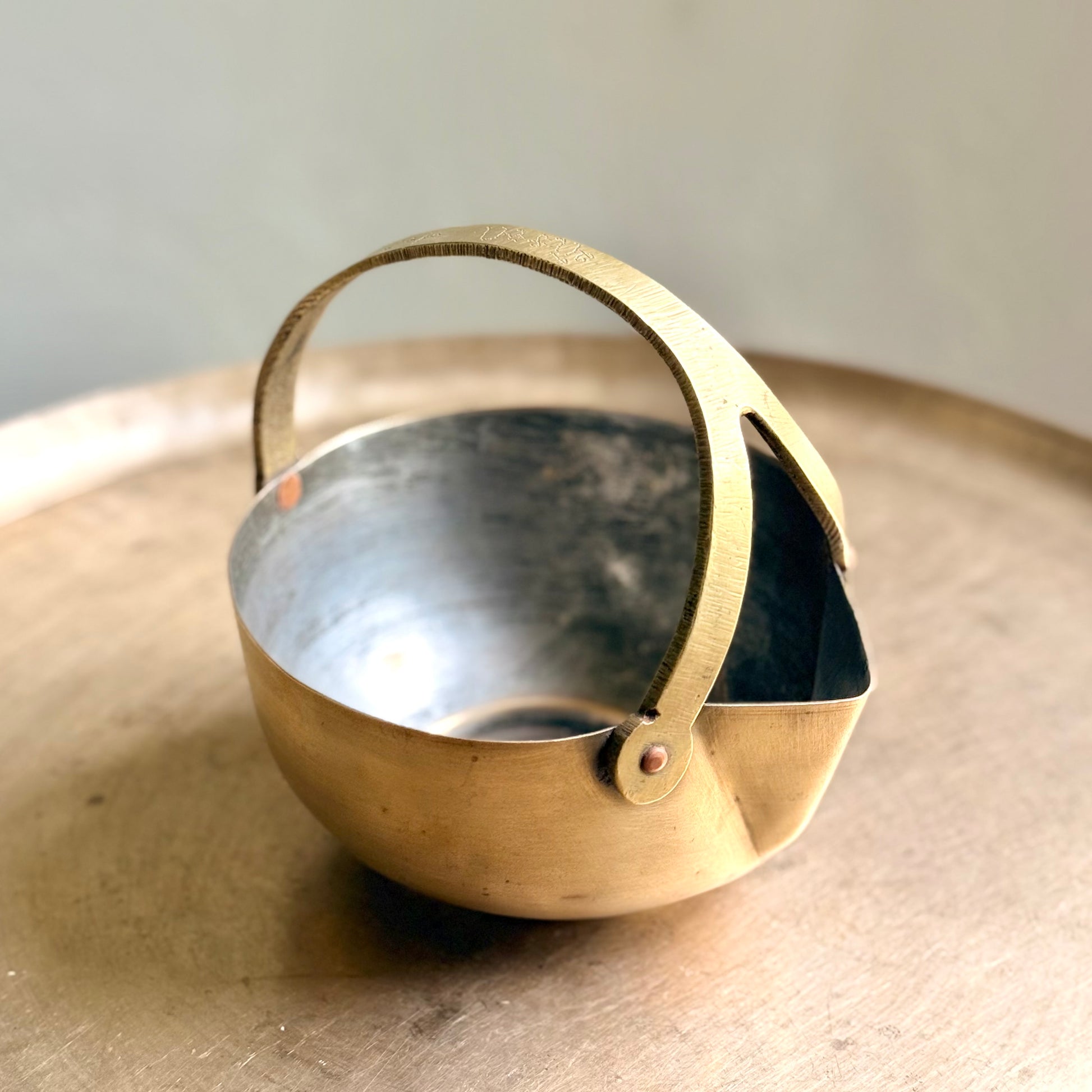 The brass Mukku Vaali from Kerala are truly distinctive pieces, steeped in a rich cultural history.. These brass utensils, known for their distinctive patterns, were traditionally used for serving rasam, payasam, and various beverages. Crafted by skilled artisans, they feature reinforced, riveted bronze 'Y' holders, making them both durable and stylish.