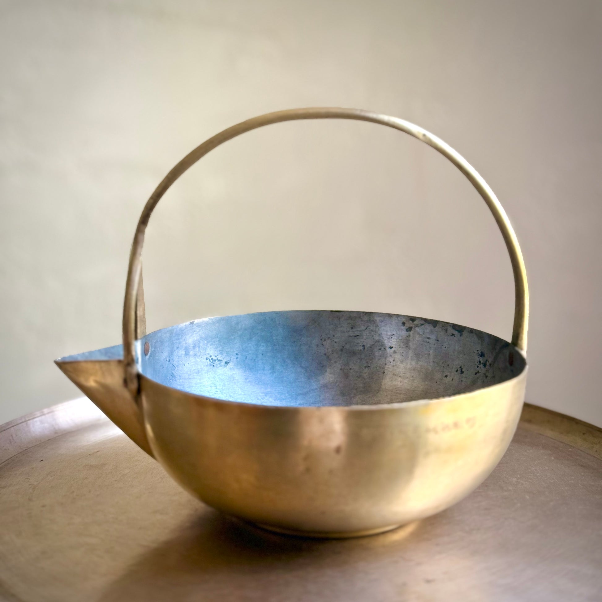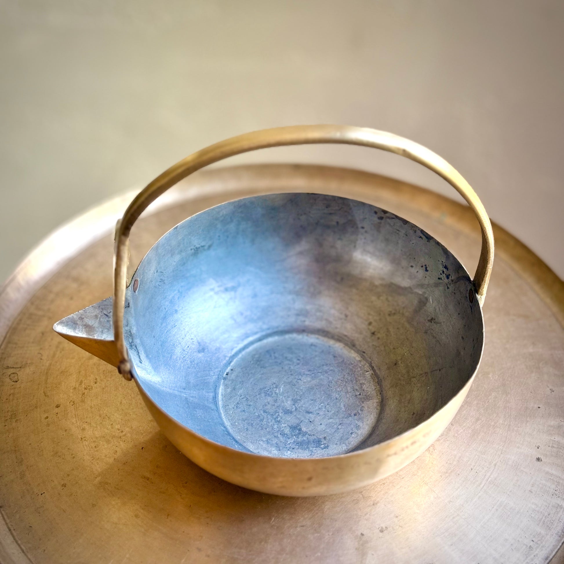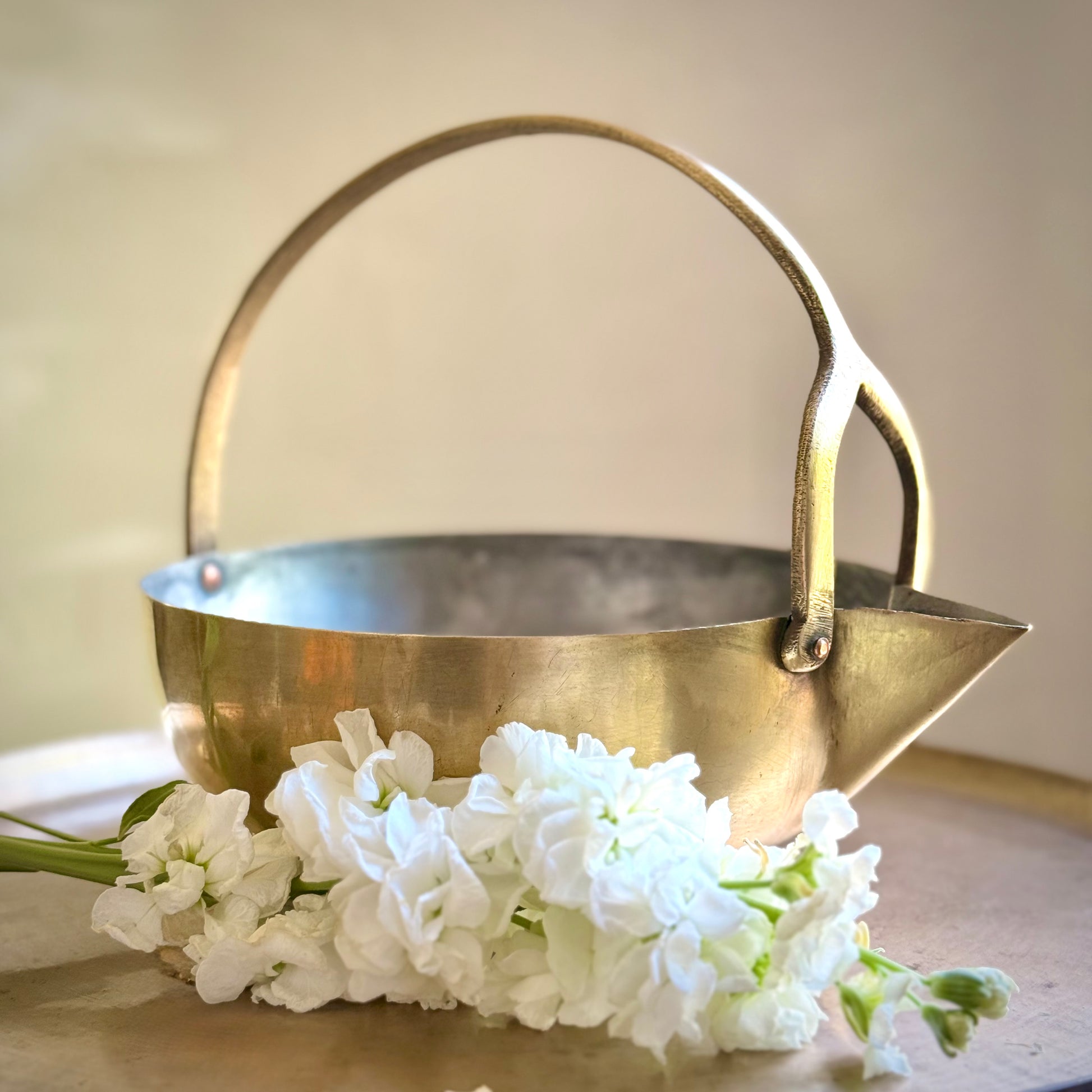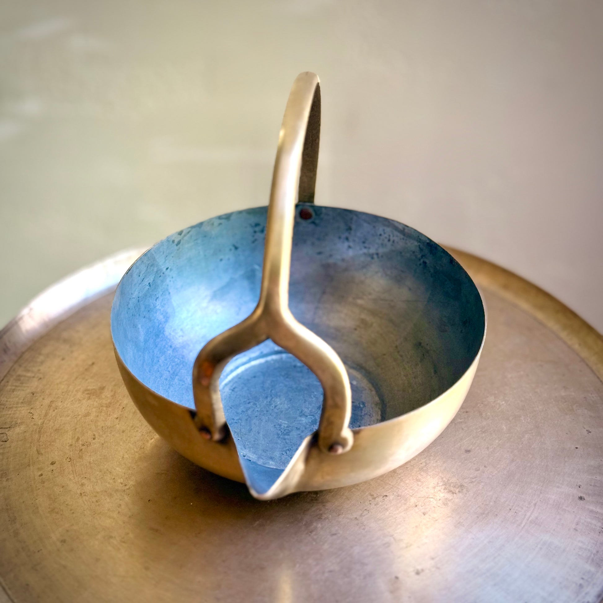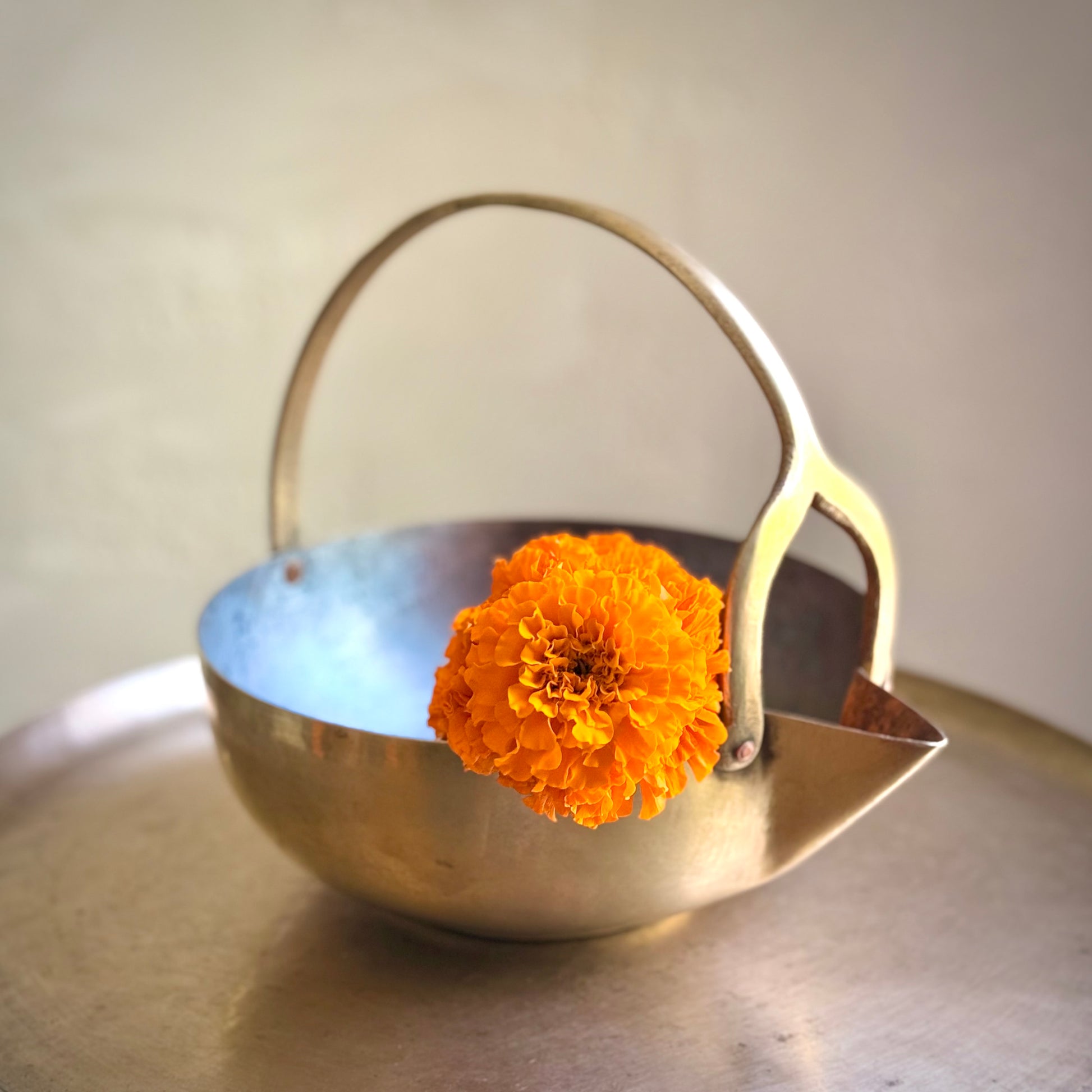 The brass Mukku Vaali from Kerala are truly distinctive pieces, steeped in a rich cultural history.. These brass utensils, known for their distinctive patterns, were traditionally used for serving rasam, payasam, and various beverages. Crafted by skilled artisans, they feature reinforced, riveted bronze 'Y' holders, making them both durable and stylish.