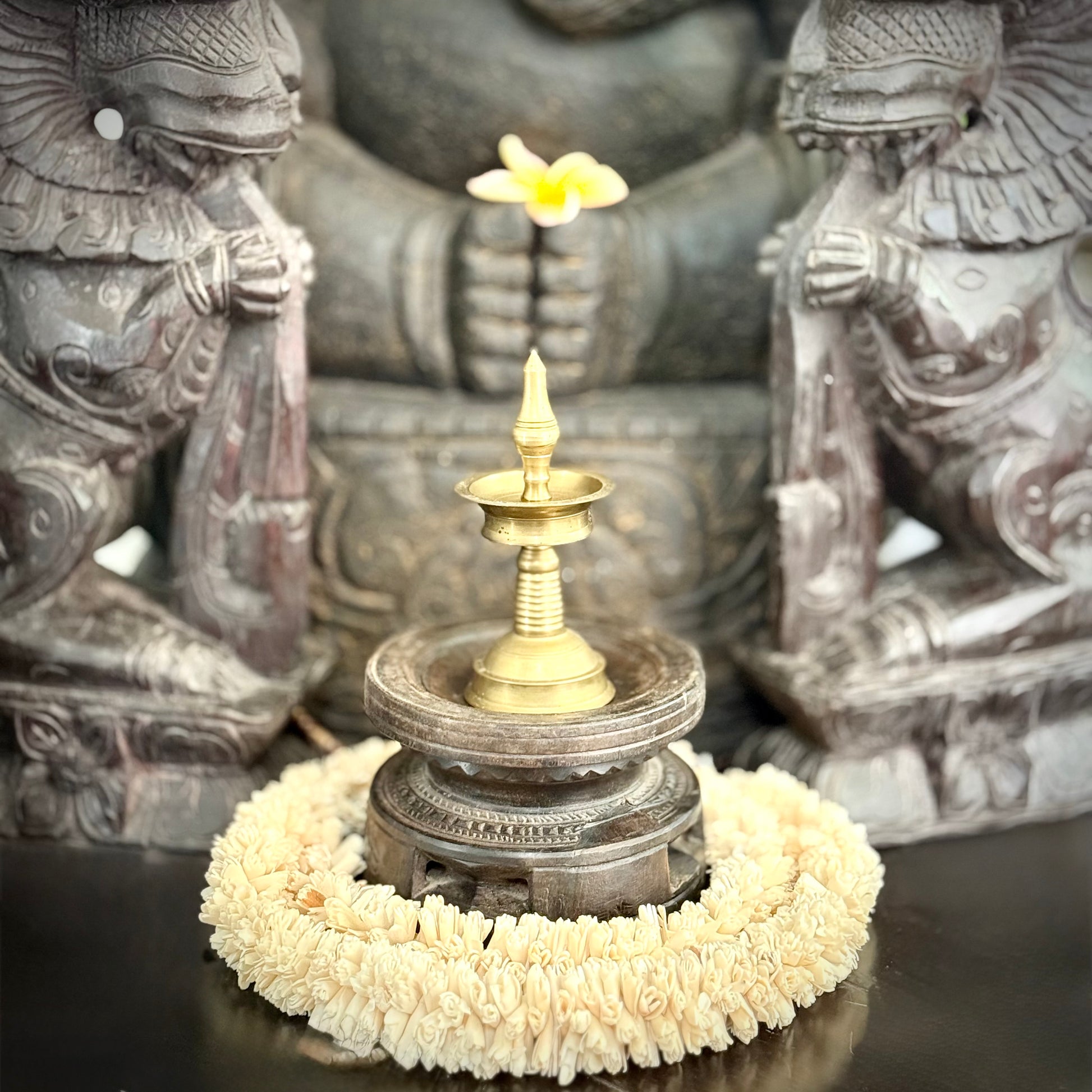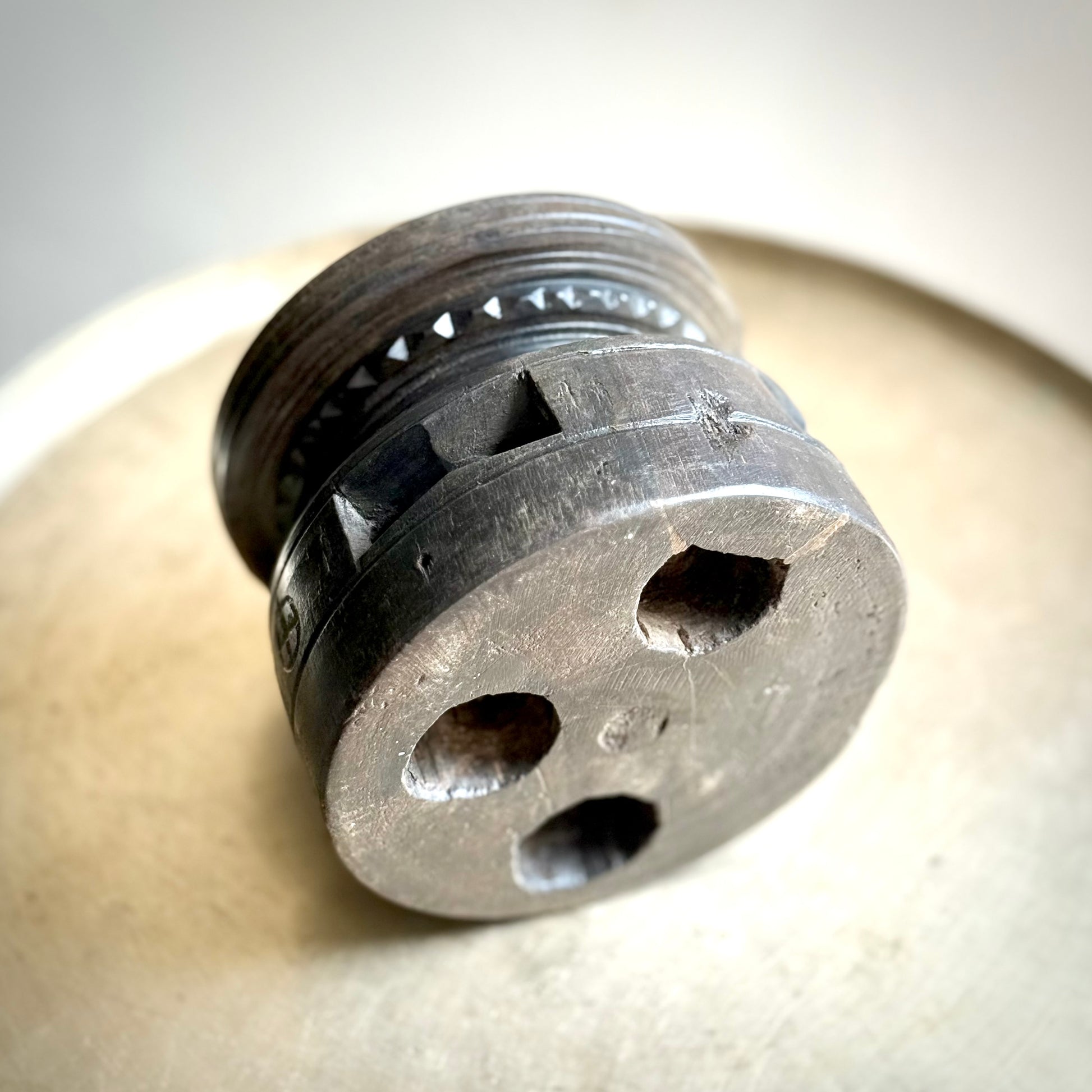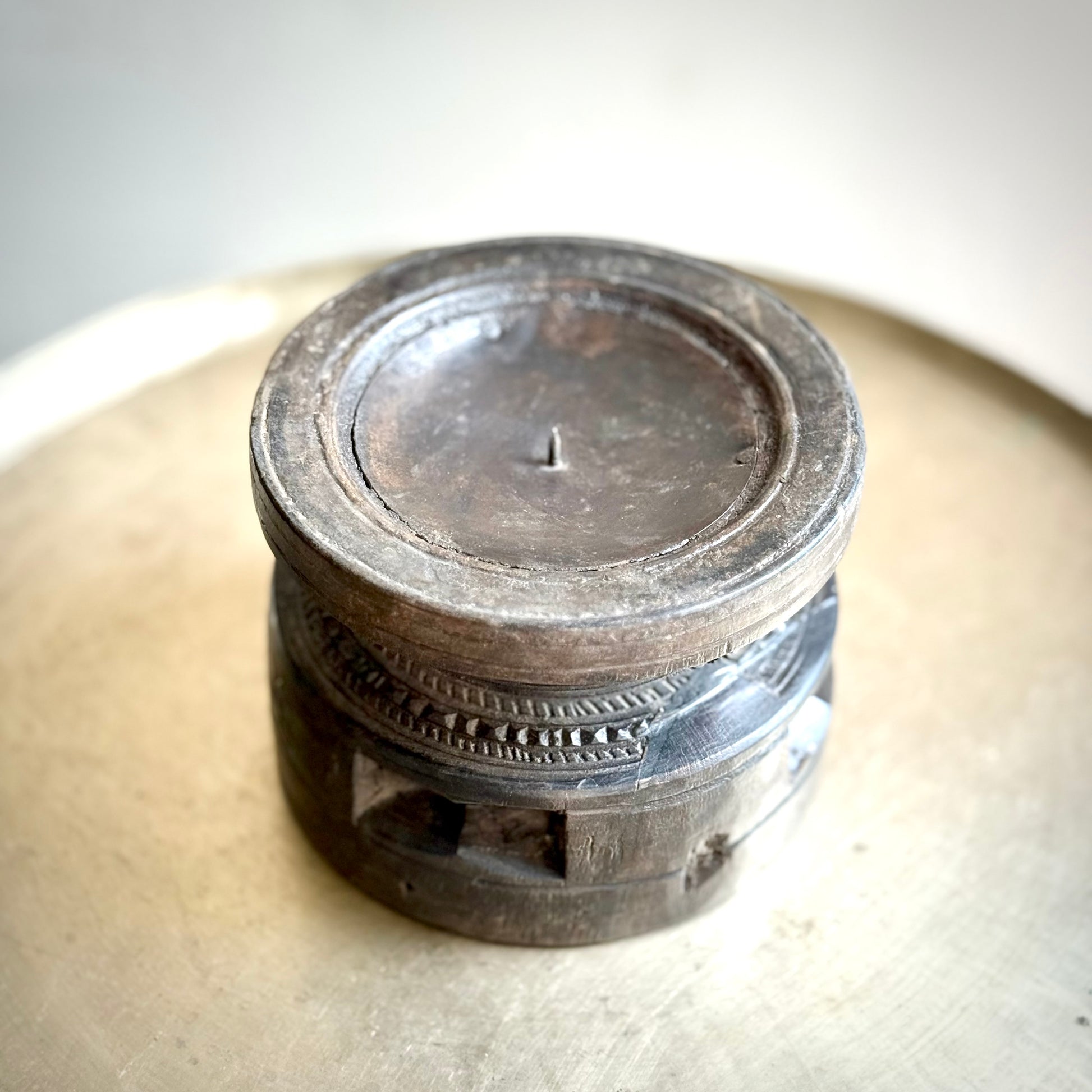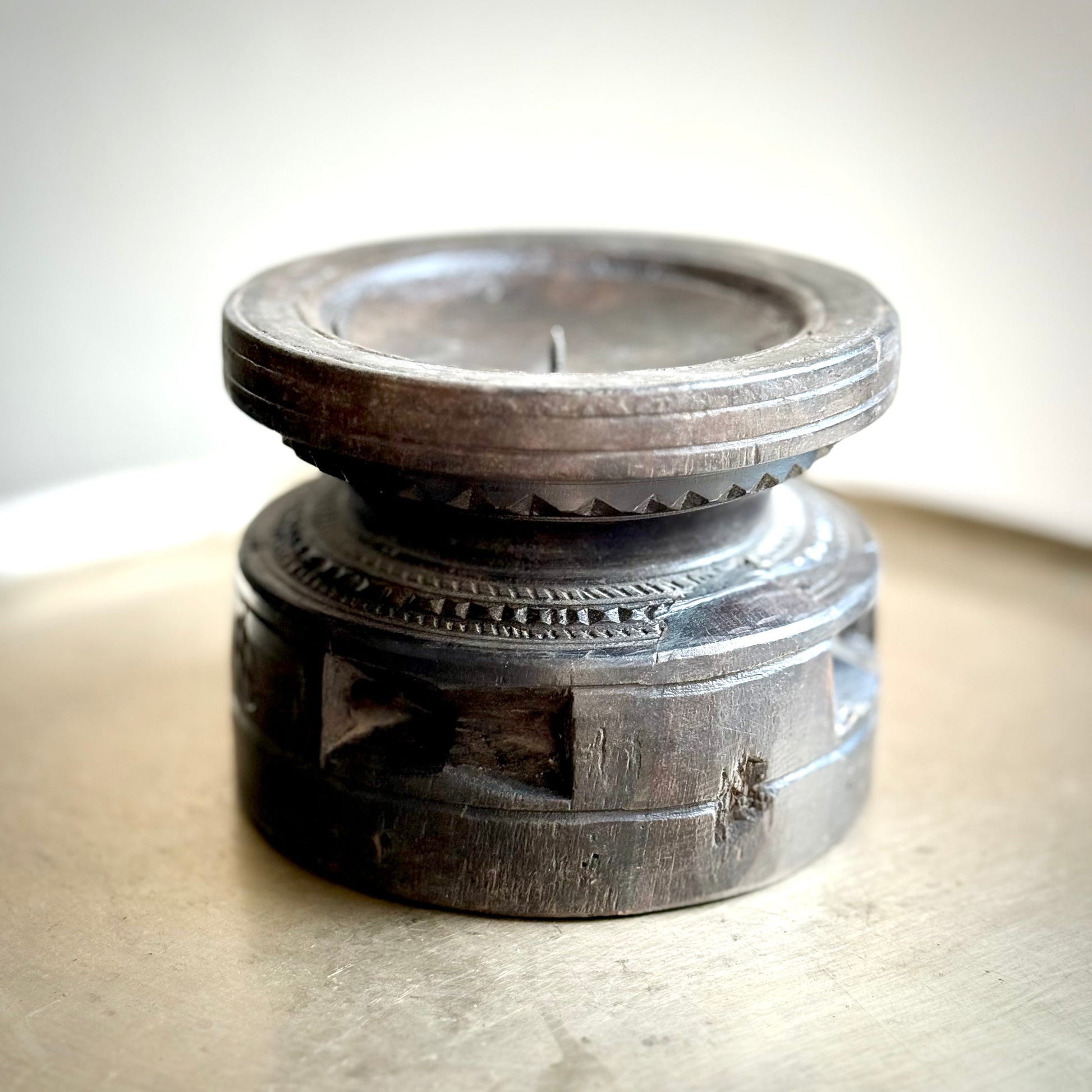 This vintage wooden candle stand captures the essence of Indian craftsmanship. Its sturdy square base features a beautifully hand-etched motif— inspired by tribal or folk art—bringing symbolic charm to its form. The circular top with a central spike securely holds a candle, while the finely grooved rim adds a subtle touch of elegance.