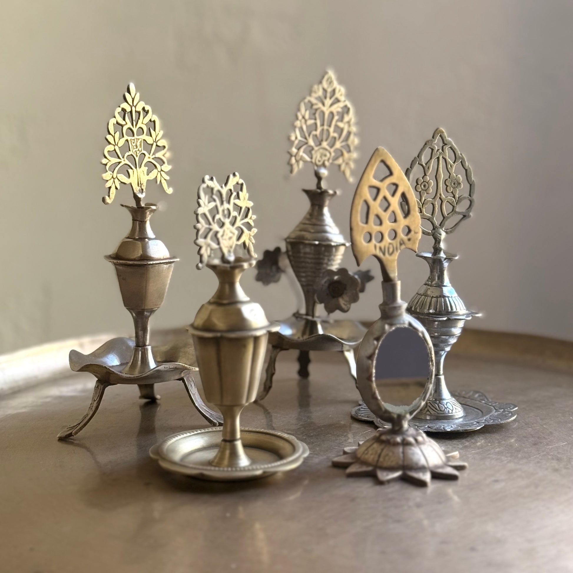 Experience the charm of a bygone era with these exquisite vintage Surmedaanis from Lucknow. Crafted over 60 years ago, these unique pieces combine functionality with timeless beauty. Their intricate jaaliwork graces the tops, while the bodies feature delicate mirrors—a practical touch for applying kajal with precision. Each Surmedaani’s holder is elegantly designed and screws into the lower portion, which holds the kohl, showcasing the skillful craftsmanship of its time. Beyond their practical use, these Surmedaanis are collectible treasures, embodying the artistry and heritage of a past generation.