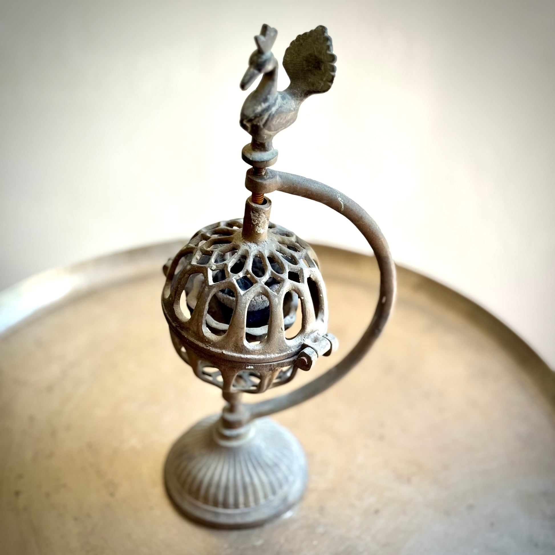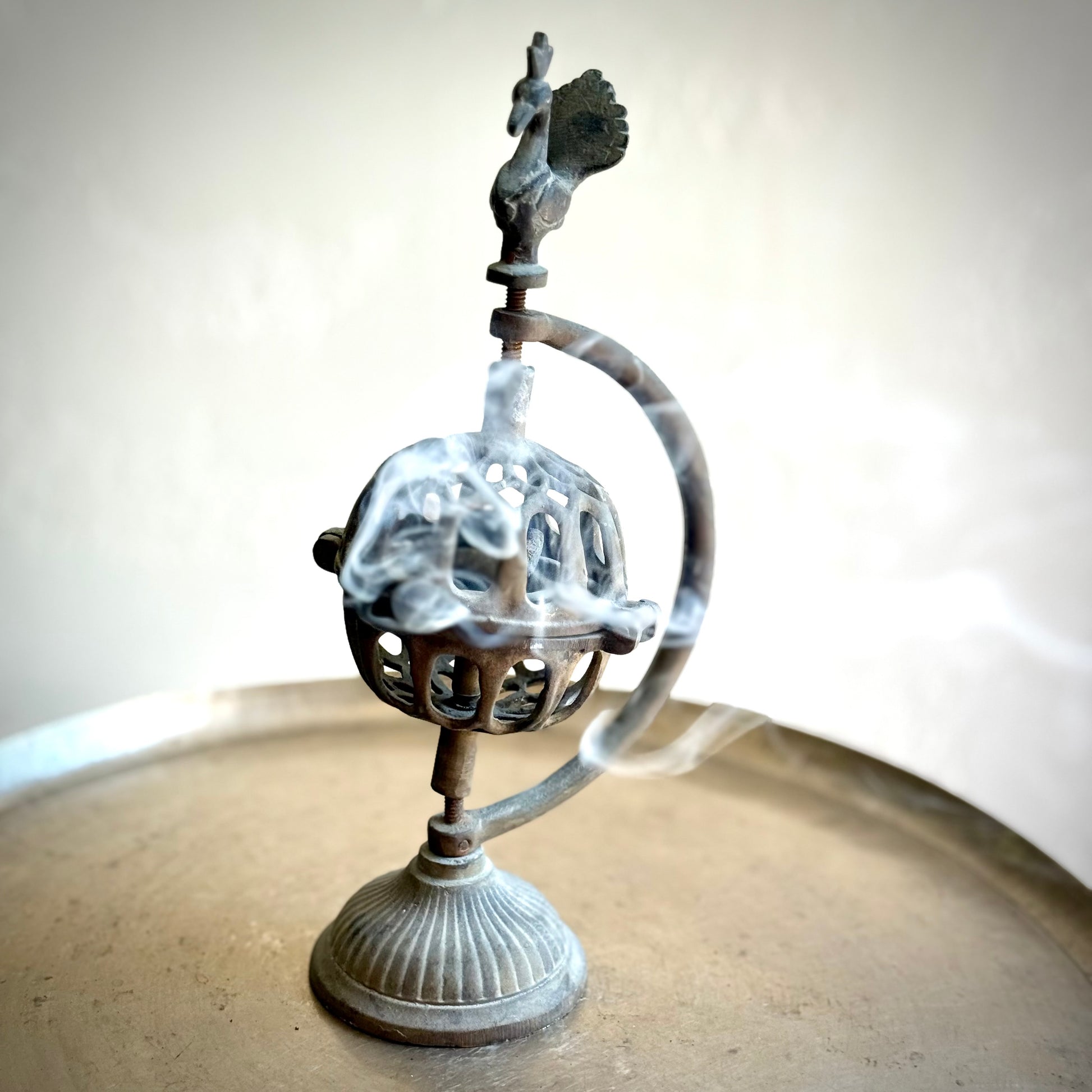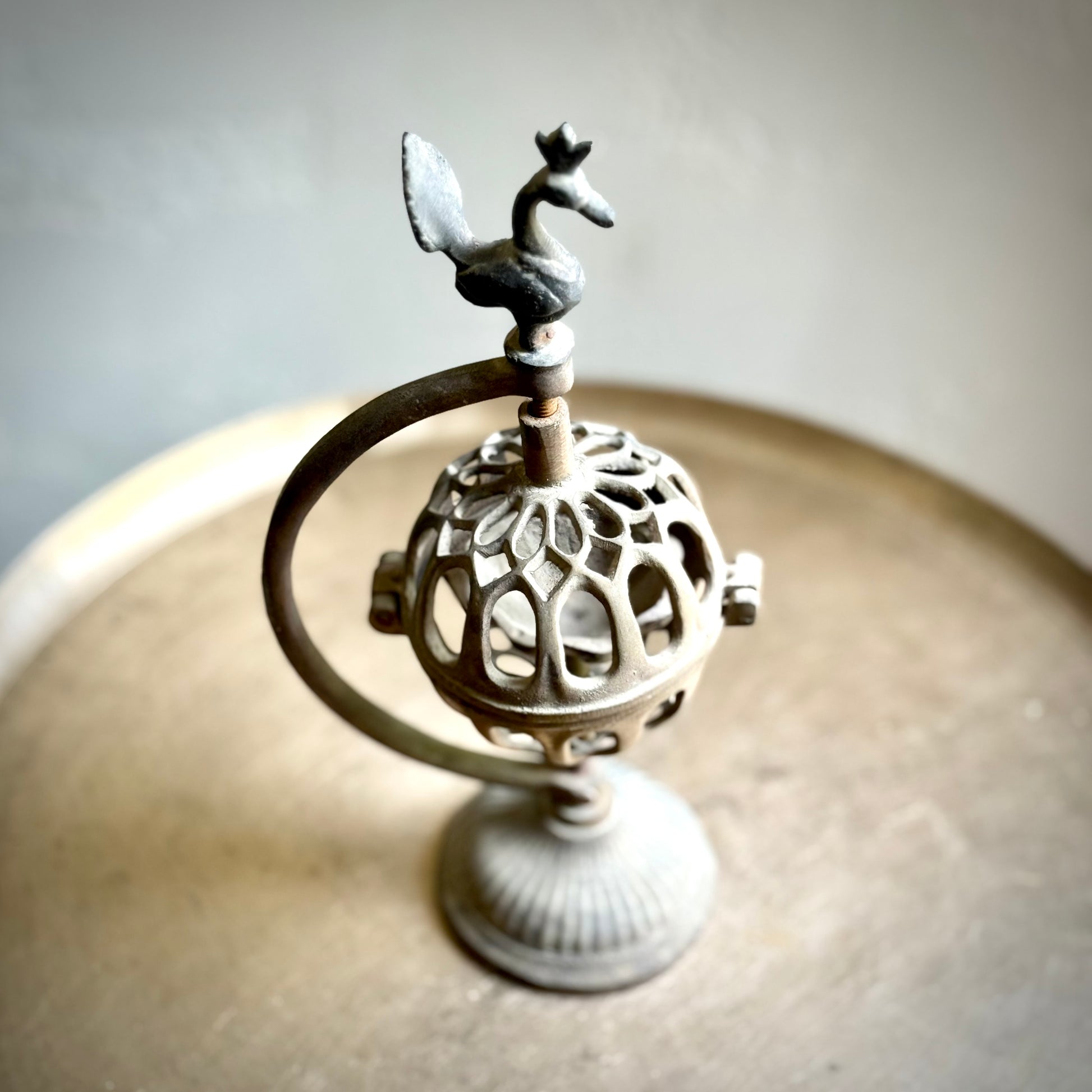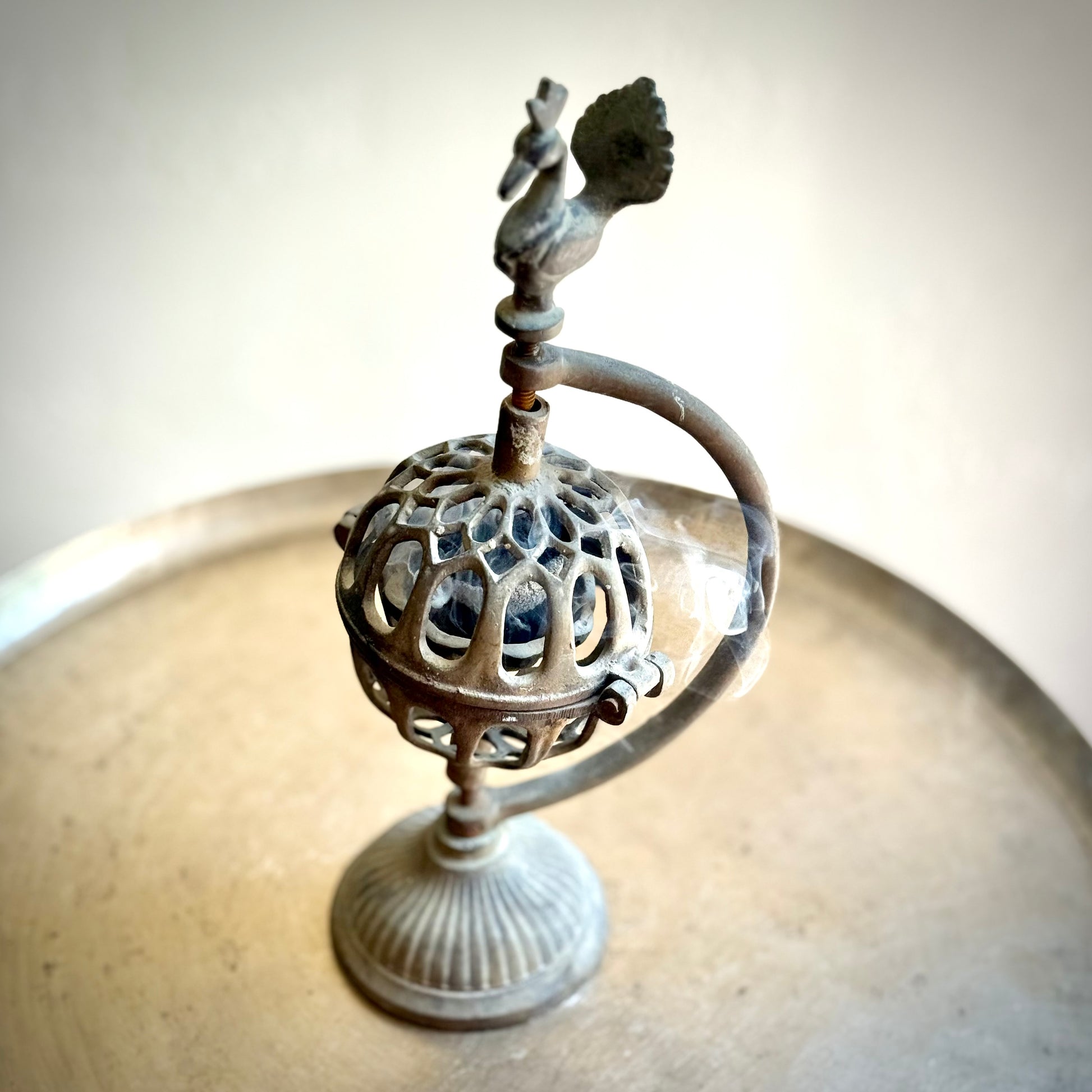 Crafted from solid brass, this incense burner serves as a timeless vessel for that experience. A sculpted peacock crowns the lid, which unscrews to reveal a chamber for placing dhoop, loban, or resins. As smoke rises through the intricately pierced dome, it fills the air with warmth and quietude. The rotating globe-style design rests on a fluted base, blending functionality with refined beauty.